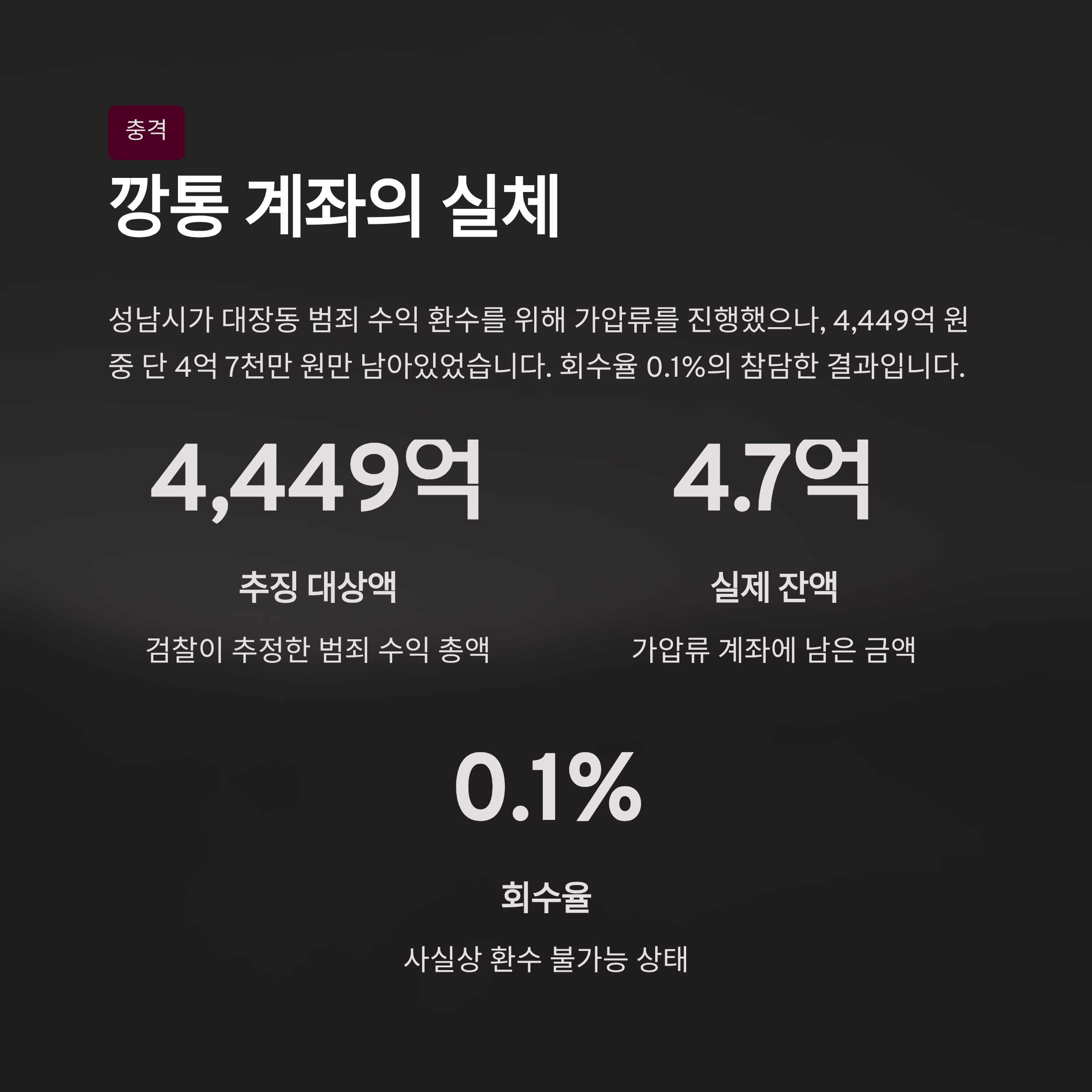 참담한 회수율: 성남시는 법원으로부터 대장동 일당에 대한 14건의 가압류 인용 결정을 받아냈으나, 검찰이 추정한 범죄 수익 4,449억 원 중 가압류 계좌에 남아있는 잔액은 약 4억 7천만 원에 불과했습니다.