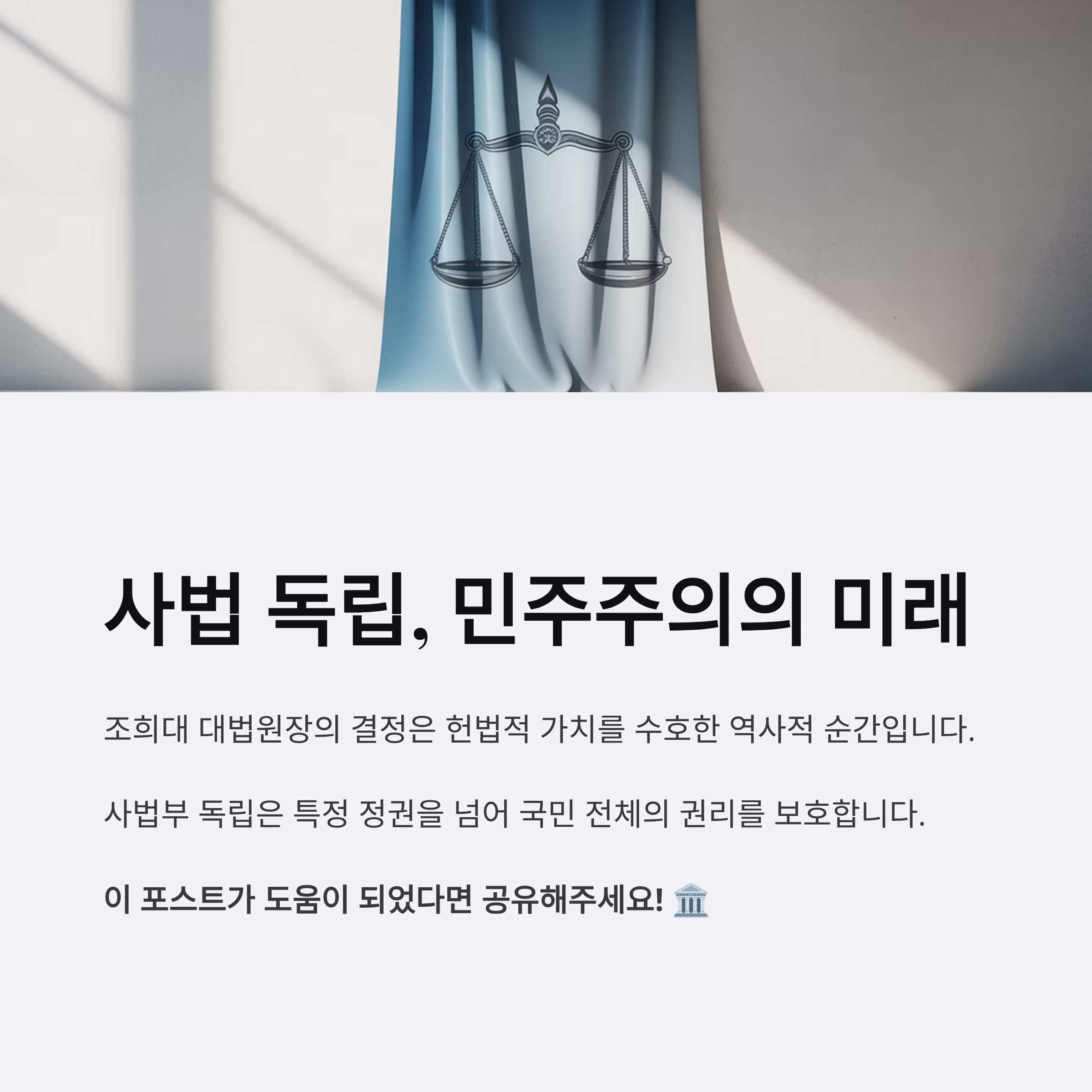 이번 조희대 대법원장의 결정은 단순한 정치적 갈등을 넘어서 대한민국 민주주의의 핵심 원칙인 권력 분립과 사법부 독립을 상기시키는 사건이었습니다. 법치주의가 흔들리는 상황에서도 사법부가 중심을 잡으며 헌법적 가치를 수호한 점은 매우 고무적입니다. 한편, 정치권은 헌법적 원칙을 존중하면서 건전한 견제와 균형을 이루는 것이 중요합니다. 사법부 독립의 가치는 특정 정권의 유불리를 넘어, 국민 전체의 권리와 민주주의 체제를 수호하는 데 있습니다. 따라서 국민은 이러한 사법부의 결정을 지지하며, 사법부와 정치권 간의 건강한 관계를 주시할 필요가 있습니다. 향후에도 사법부는 외부 압력에서 독립적으로 작동하며 국민의 신뢰를 쌓아가는 역할을 계속해야 할 것입니다. 정치권도 헌법적 가치를 존중하며 권력 간 균형을 유지해야 한다는 점에서 깊이 자각할 필요가 있습니다.