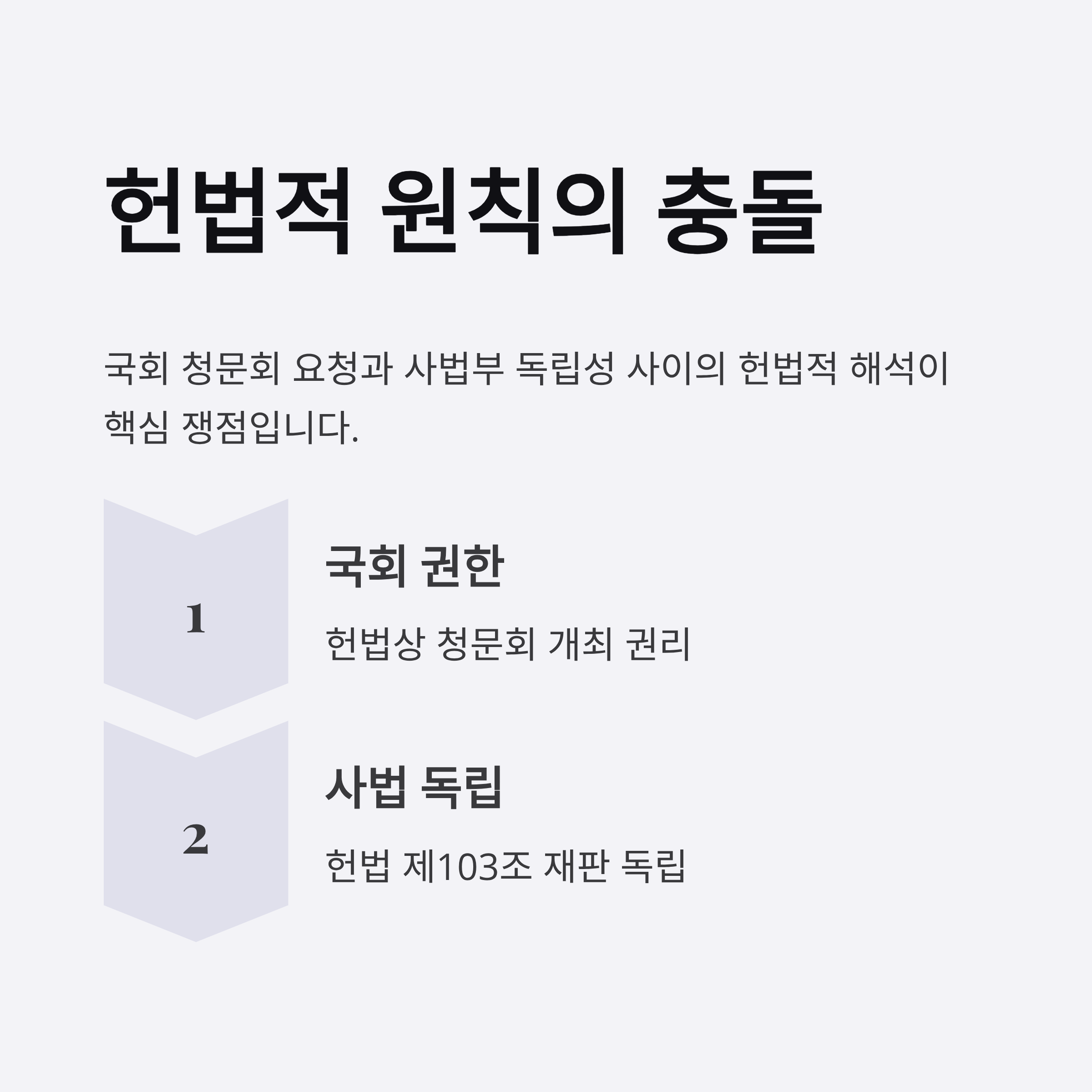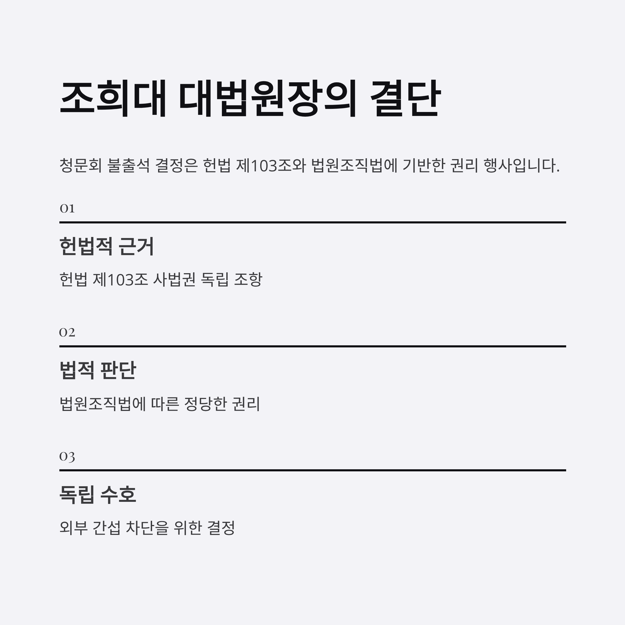 1. 조희대 대법원장은 청문회 출석을 거부하며, 이는 헌법 제103조와 법원 조직법에 기반을 둔 결정을 명확히 했습니다.