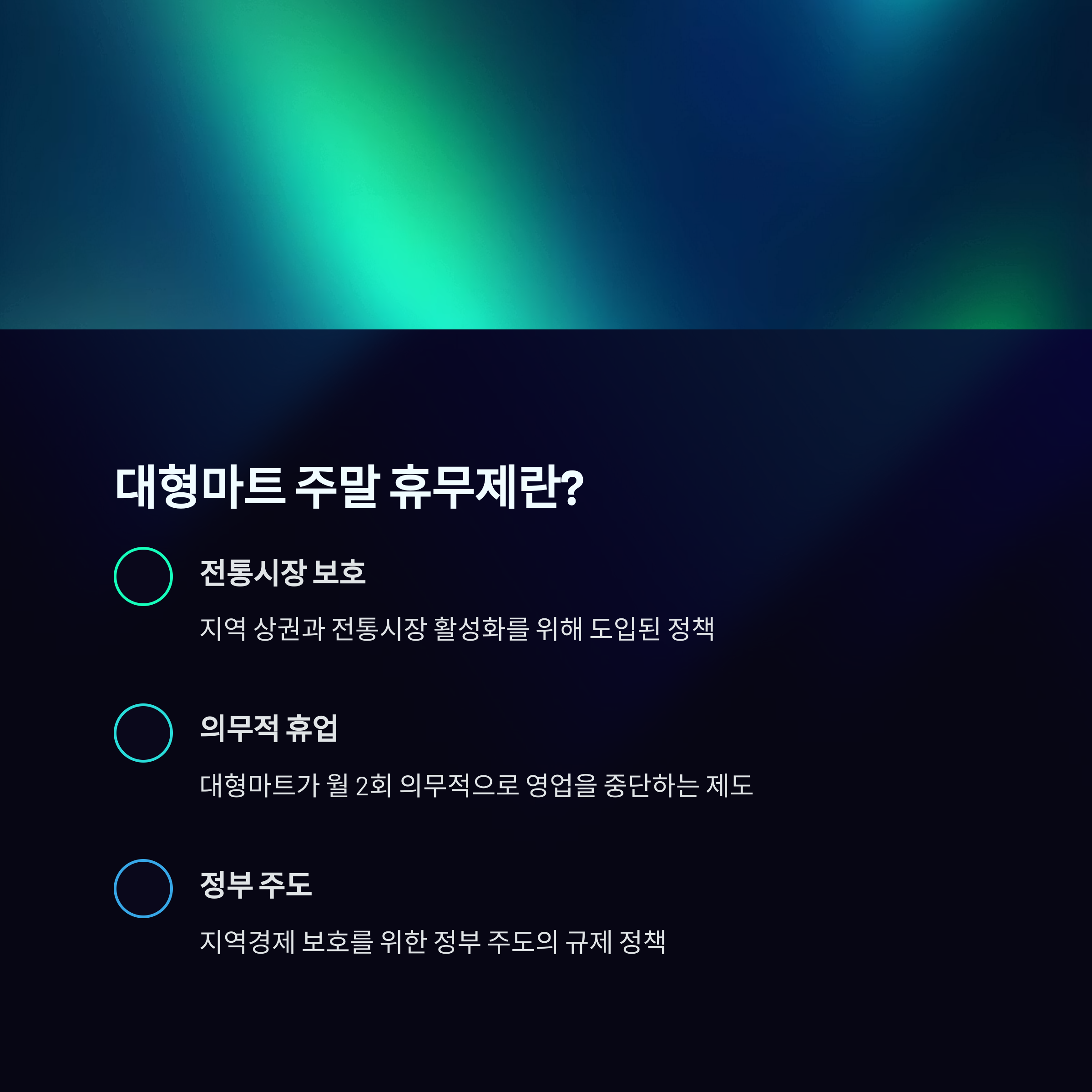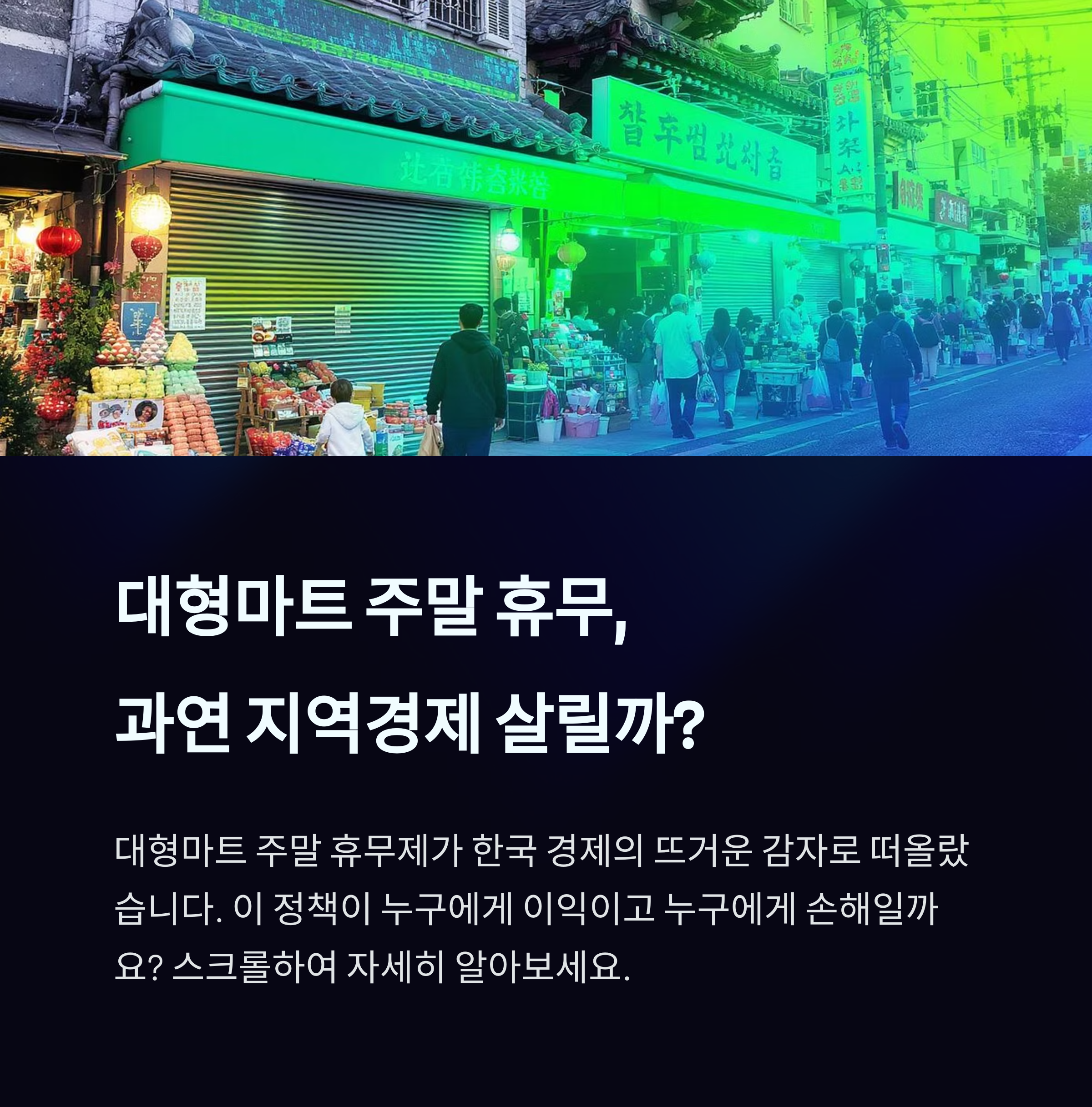 - 대형마트 주말 휴무 강제화는 지역 전통시장 활성화 및 지역사회를 지키기 위한 정책입니다.
