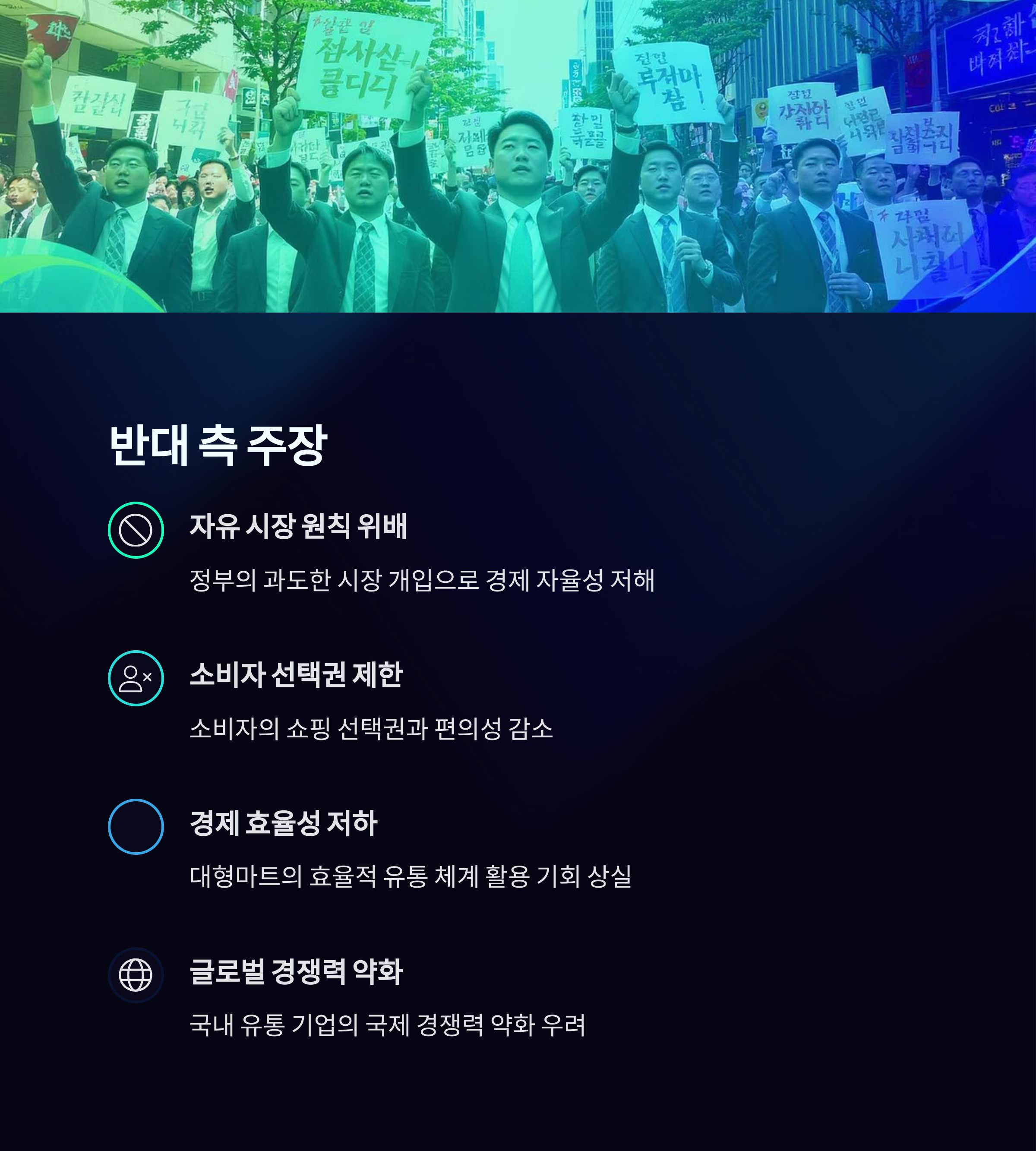 - 정책 지지자들은 지역경제 활성화 효과를 기대하지만, 반대자들은 선택권 제한과 매출 감소를 우려합니다.
