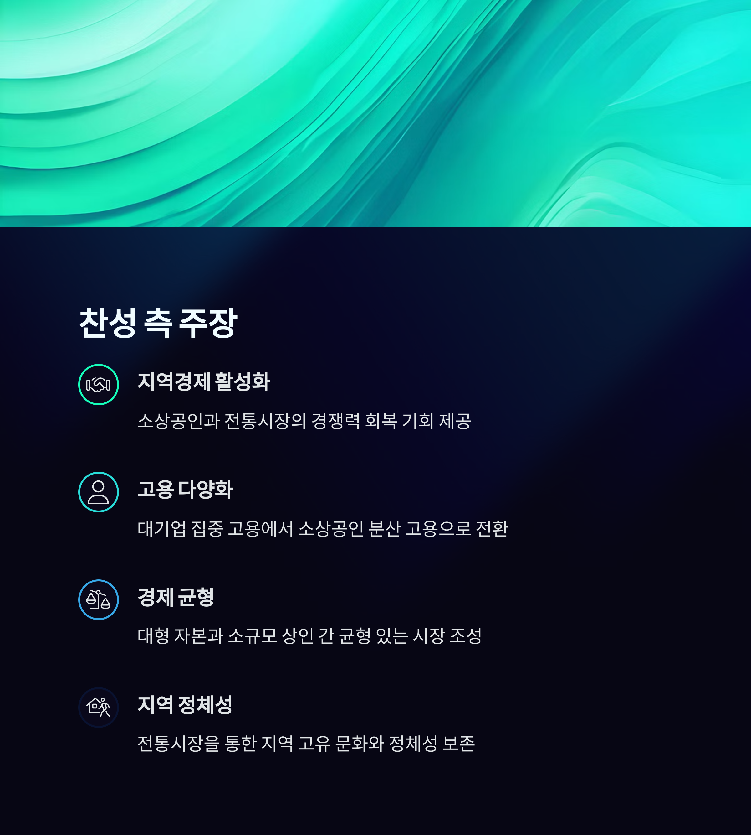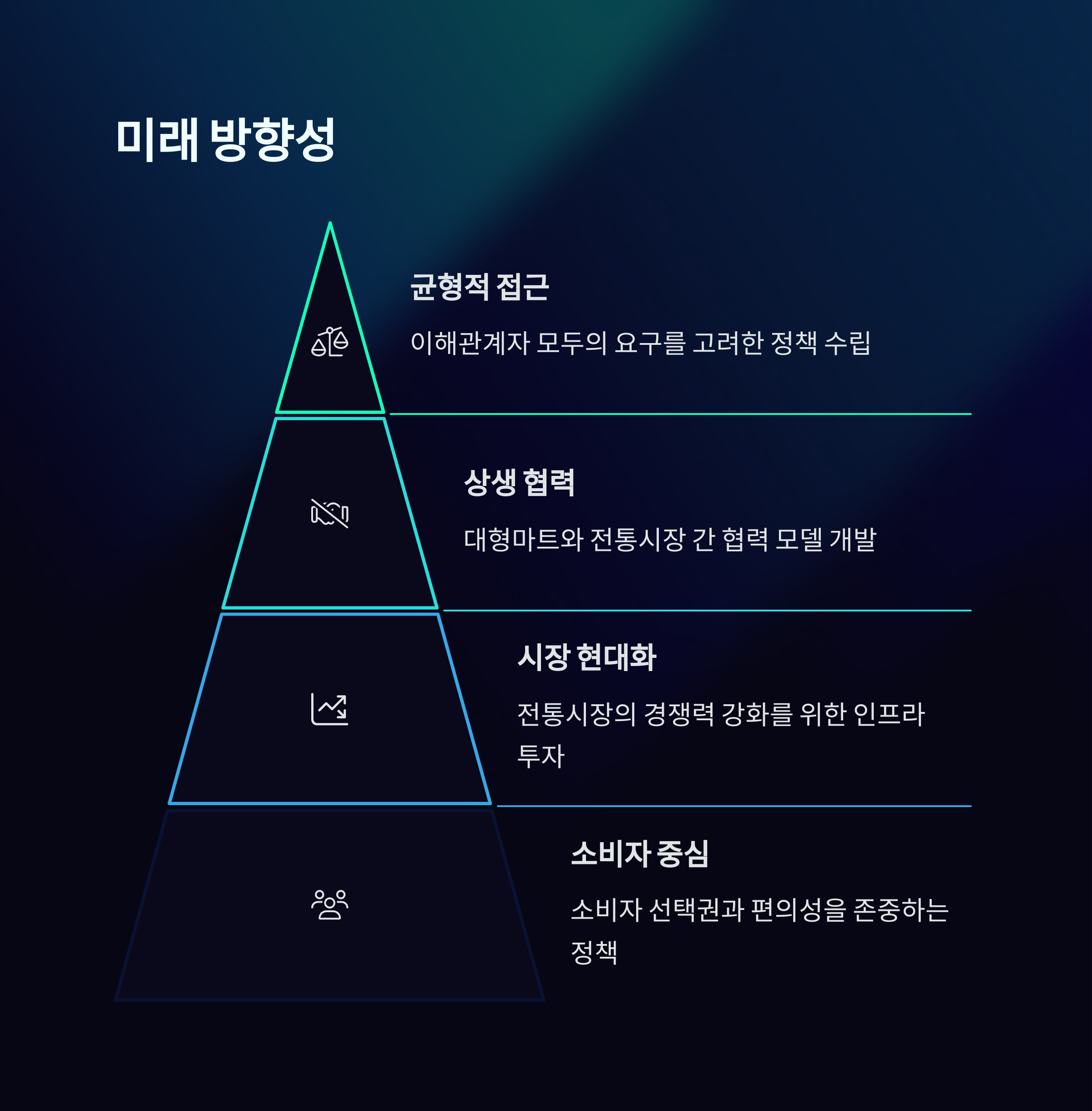 향후에는 소비자 보호와 산업 경쟁력 제고를 동시에 충족시킬 수 있는 포괄적 방안 마련이 중요하며, 기술 혁신을 기반으로 전통시장과 대형마트 간 협업 모델을 개발하는 것도 하나의 대안이 될 수 있습니다.