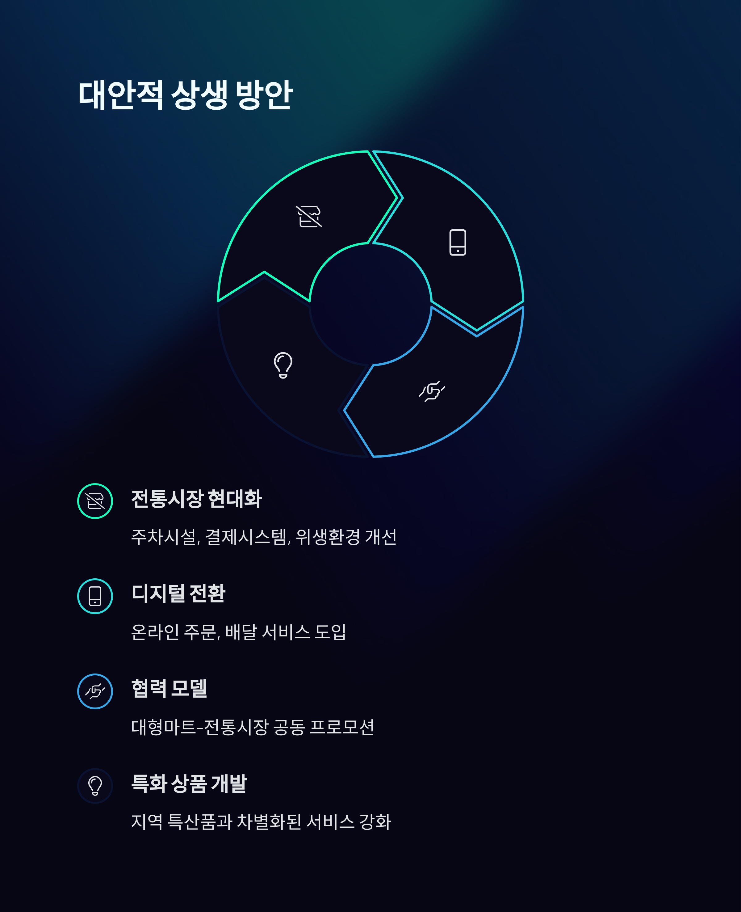 | A. 전통시장 특화 상품 개발, 공동 프로모션 캠페인 진행 및 대형마트와의 물류 협력 등이 현실적인 방안으로 제안되고 있습니다. 또한 공공 정책을 활용하여 디지털 마케팅과 온라인 확장을 지원할 수 있습니다. |