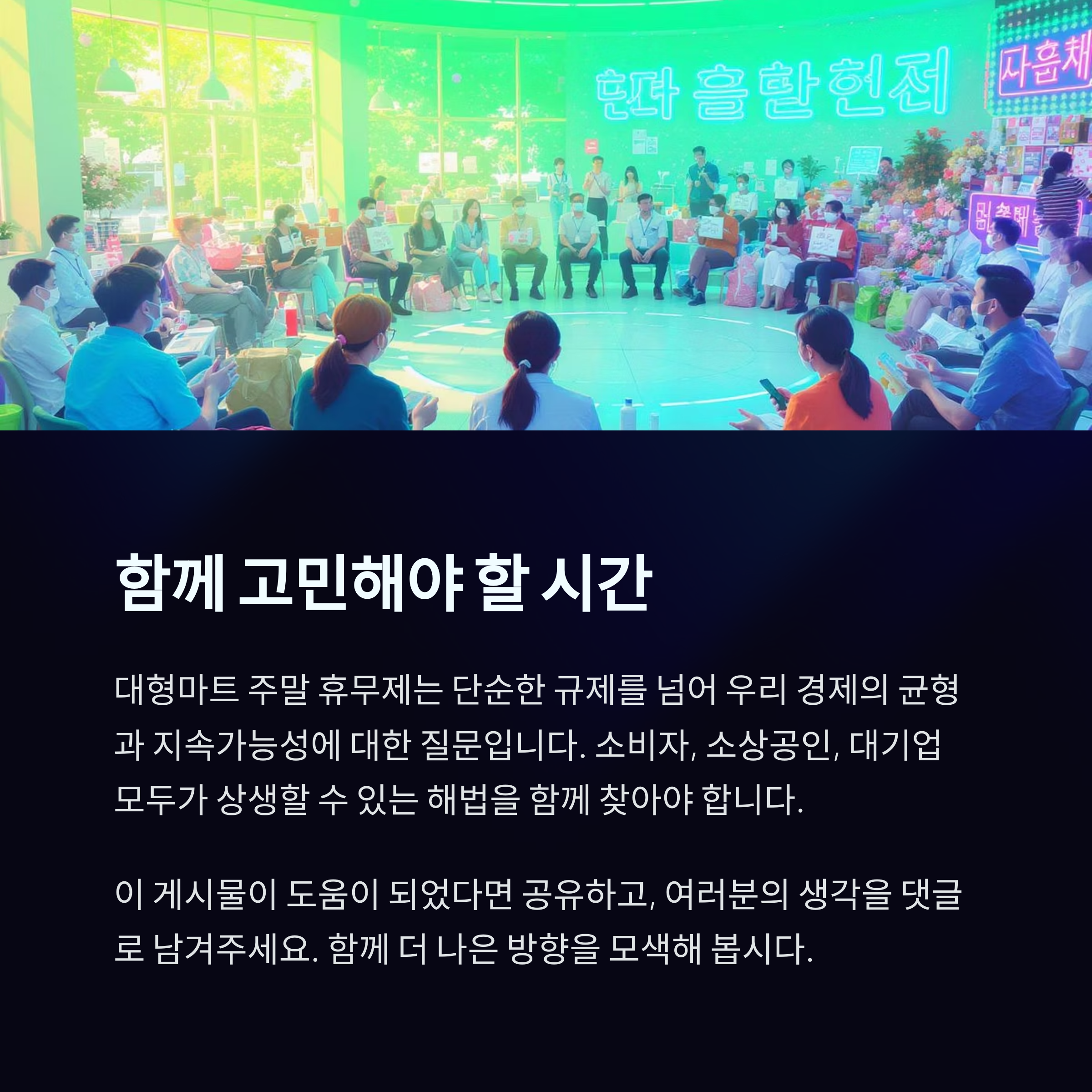 대형마트 주말 휴업 강제화는 전통시장 활성화와 지역 상권 보호라는 긍정적인 목적을 가지고 시작되었습니다. 그러나 이러한 규정이 가져오는 경제적 손실, 유통업계의 반발, 소비자 불편 등을 현실적으로 고려해야 합니다. 전통시장과 대형마트, 그리고 소비자 간의 균형 잡힌 지속 가능한 대책이 필요하며, 이를 위해 정부와 다수의 이해 당사자 간 추가 논의가 요구됩니다.