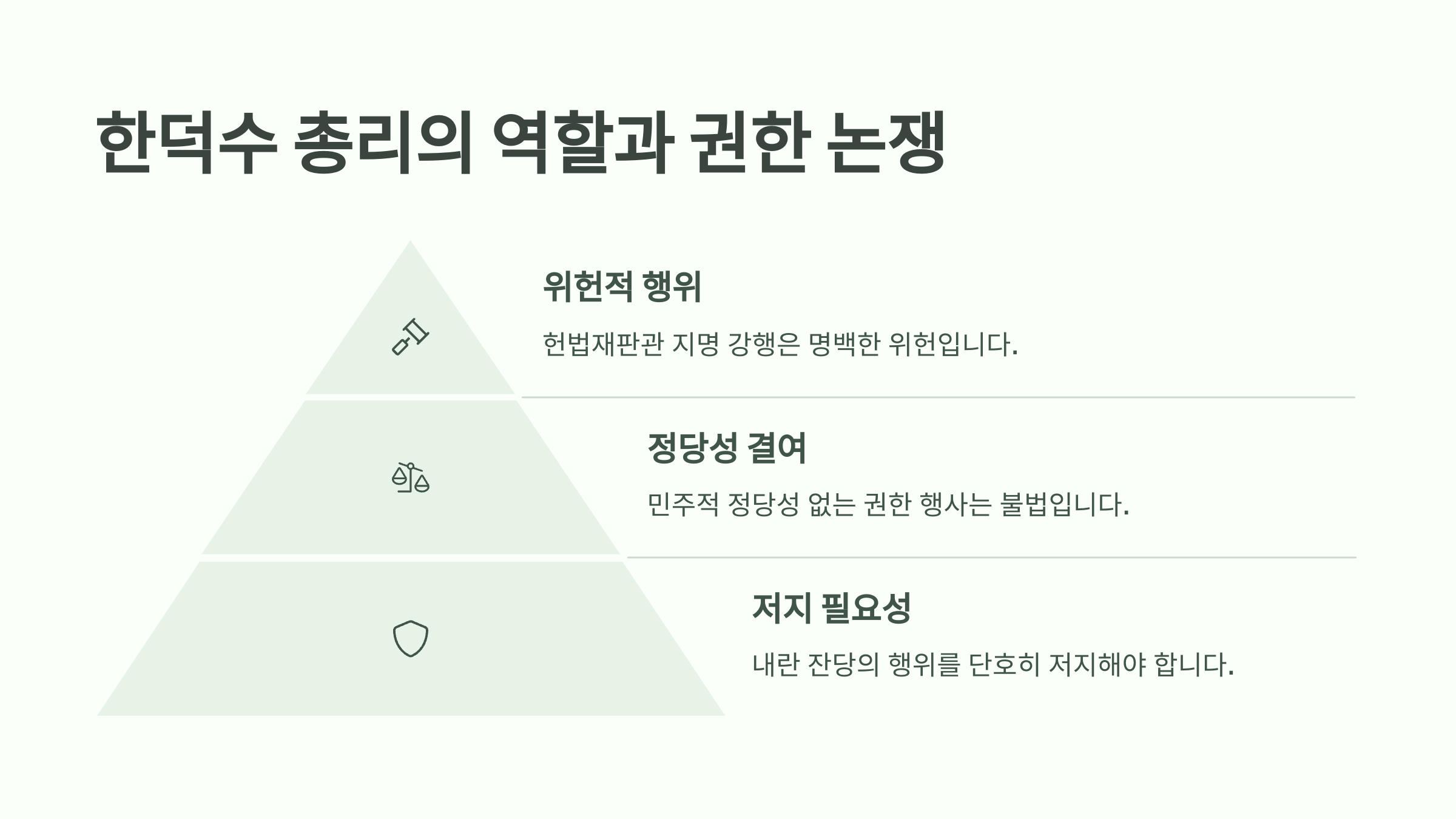 한덕수 총리의 헌법재판관 지명 강행은 위헌적이며, 민주적 정당성 없이 국가 권한을 행사하는 불법 행위로 규정되었다. 이에 대해 민주당은 모든 수단을 동원하여 저지하겠다는 강경한 입장을 밝혔다. 이는 내란 잔당에 대한 정리 차원에서도 의미 있는 조치로 간주되고 있다.