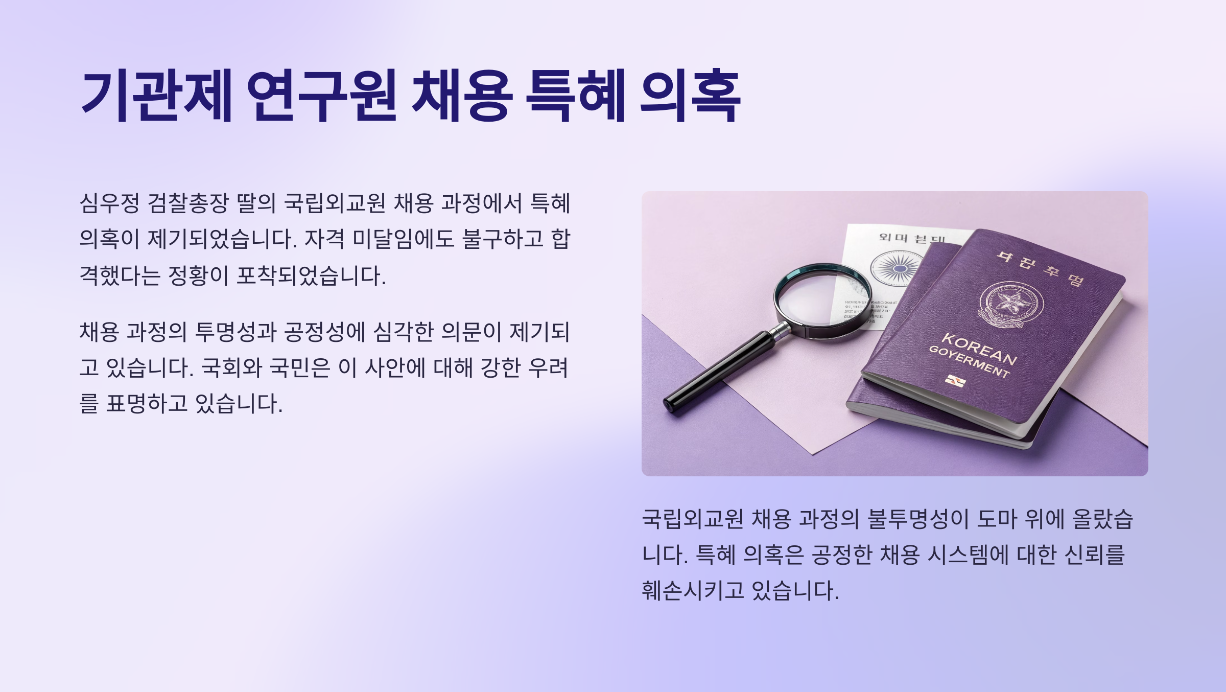 더불어민주당은 신 모 검찰총장 자녀가 2024년 국립외교원 기관제 연구원으로 채용된 과정에서 명백한 자격 미달임에도 불구하고 선발된 점을 지적하며, 고위층의 특혜 채용 의혹을 제기하고 있습니다. 해당 자녀는 이후 외교부 공무직으로도 합격했으며, 자격 요건을 변경하거나 면접 점수를 몰아주는 방식은 전형적인 권력형 채용 비리의 패턴이라는 비판이 이어지고 있습니다.