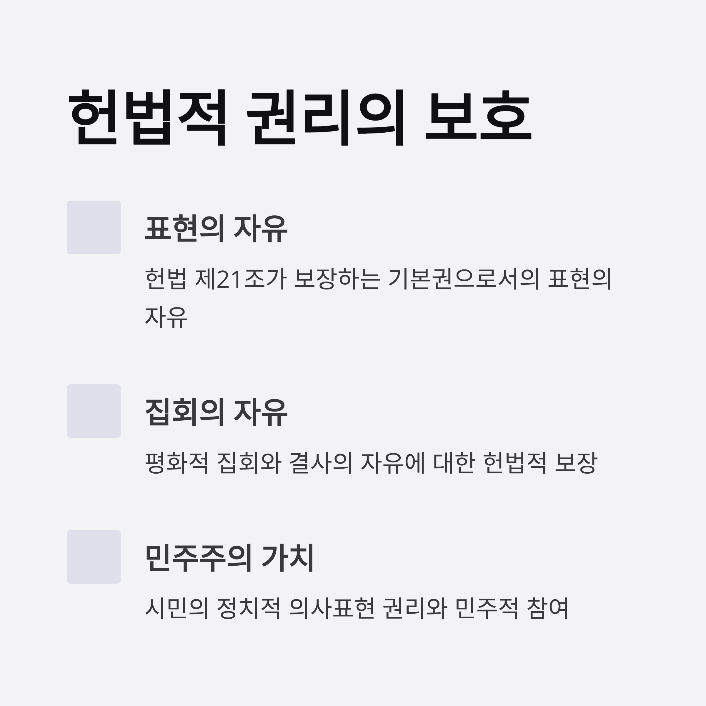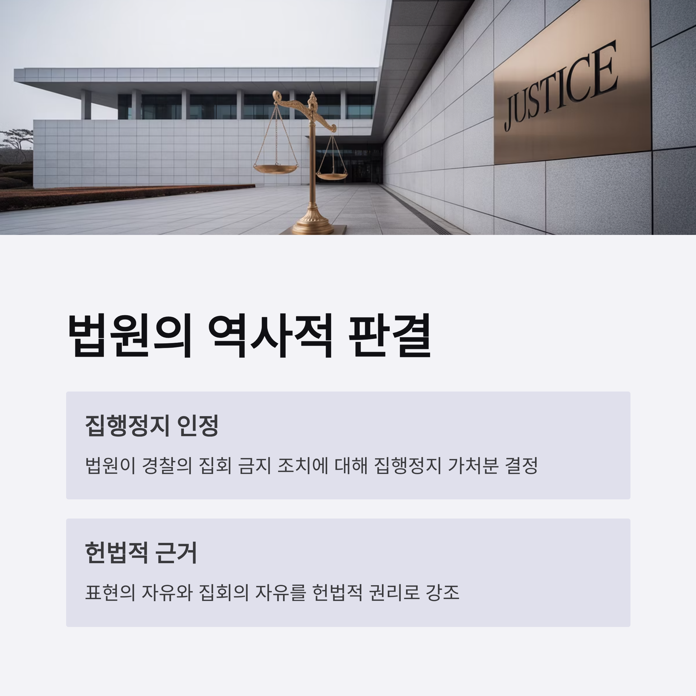 이번 판결은 헌법 제21조가 보장하는 표현의 자유와 집회의 자유가 다시 한 번 강조된 사건이었습니다. 법원은 경찰의 집회 금지 조치가 헌법적 권리를 침해할 가능성이 크다고 판단하며 시민의 기본권을 우선시했습니다. 이는 단순히 경찰의 집회 금지만이 아니라 정부와 시민 간의 갈등 속에서 헌법적 가치가 우선됨을 선언한 중요한 사례로 기능합니다. 법적 관점에서 보자면, 이는 헌법 해석의 진전을 위한 기반적 사례로 자리잡을 것입니다.