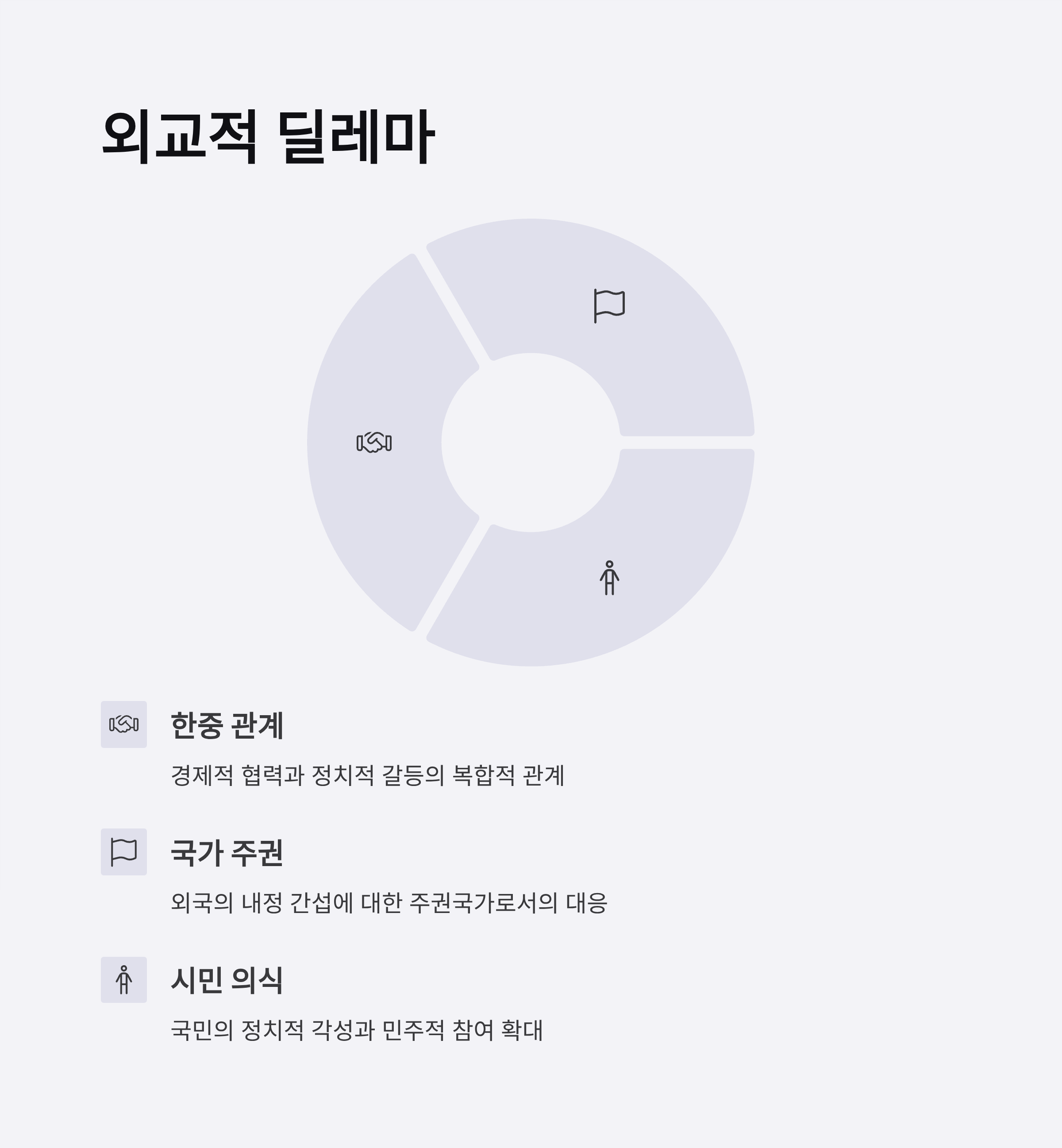 이번 사건은 단순히 국내적 목소리에 그치지 않고, 한중 간의 미묘한 외교적 관계와 한국 내 친중과 반중의 갈등을 증폭시키는 결과를 낳았습니다. 특히 언론 매체와 정치권에서 중국과의 경제적, 외교적 관계를 이유로 조심스러운 태도를 취하는 이들이 더 큰 비판의 대상이 되었습니다. 이러한 맥락은 시위가 단순 시민 권리의 표현일 뿐 아니라 국제정치의 중요한 이슈를 드러내는 창이 되었음을 보여줍니다.