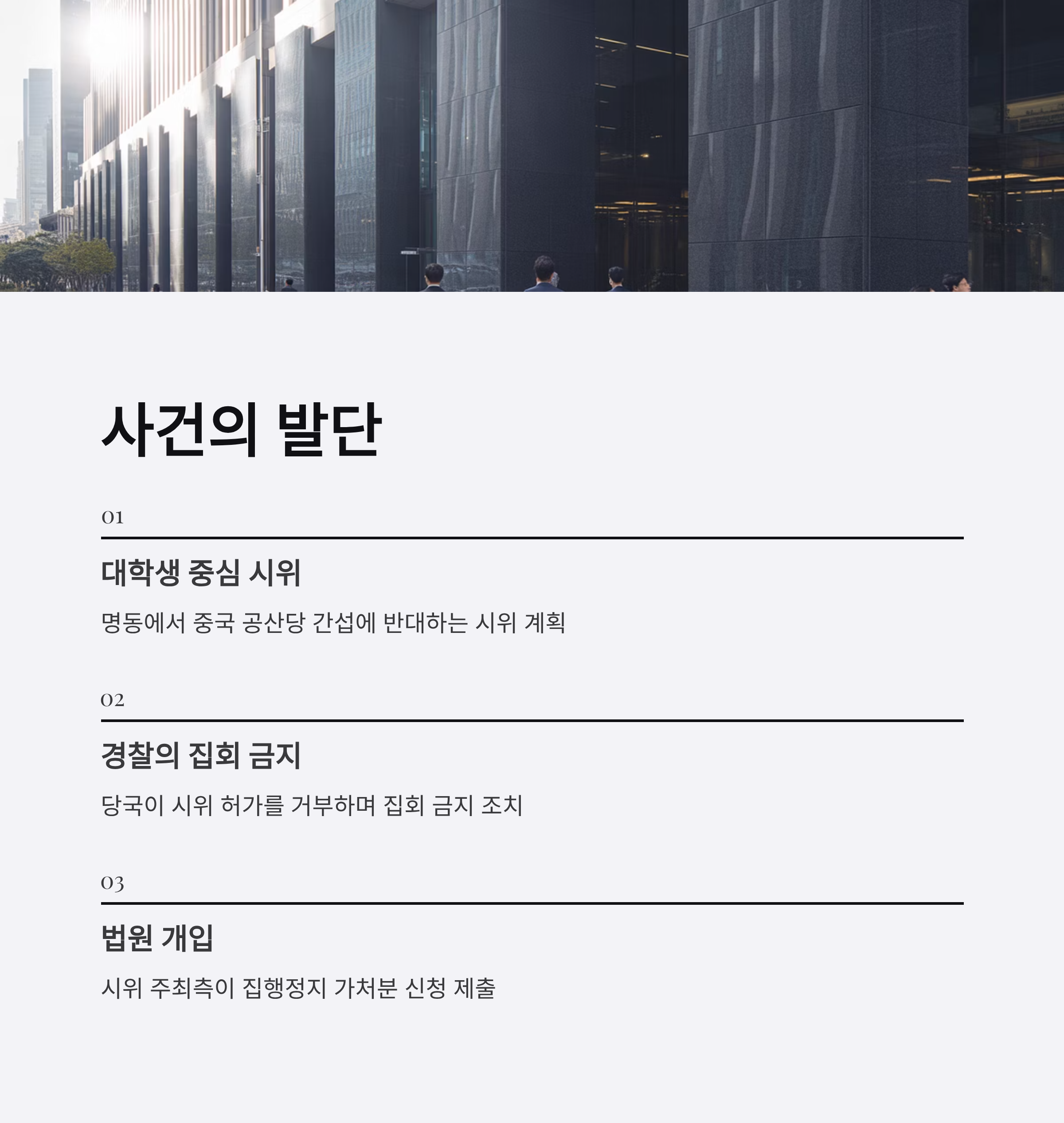최근 서울 명동에서 발생한 반중 시위와 관련한 법적 논의가 한국 사회에 큰 반향을 불러일으켰습니다. 대학생들을 중심으로 한 시위 참여자들은 중국 공산당의 간섭에 대해 목소리를 높였고, 이에 경찰은 집회를 금지하려 했습니다. 그러나 법원은 이에 대해 집행정지 가처분을 결정하며, 집회의 자유와 관련된 중요한 선례를 남겼습니다. 이번 판결은 단순한 집회 허용 여부를 넘어, 헌법적 권리로 보호되는 표현의 자유와 사회적 쟁점 사이의 균형을 논의하는 계기가 되었습니다. 글 전체에서 이번 이슈의 법적, 사회적, 그리고 정치적 의미를 다각도로 분석하며 집회의 중요성을 되새기고자 합니다.