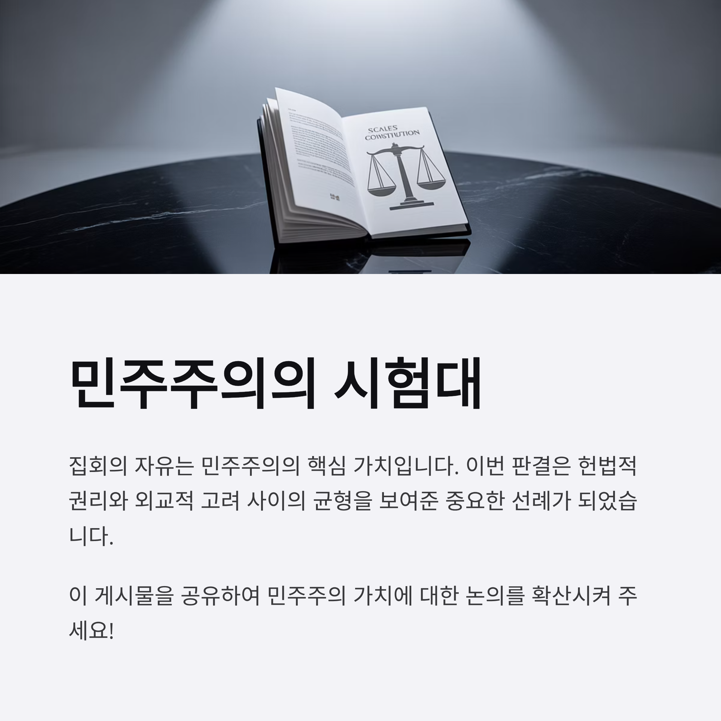 이번 판결은 헌법적 가치의 재확인이라는 점에서 의의를 가집니다. 표현의 자유와 집회의 자유를 수호하기 위해 법원이 적극적인 태도를 취한 점은 민주주의를 구성하는 주요 요소를 환기시키는 사례로 남게 될 것입니다. 그러나 국민 감정과 국제 외교 간의 균형 문제는 여전히 민감한 이슈로 남아 있습니다. 사회적 논의가 성숙해지고, 헌법적 권리와 현실적 요구 간 접점을 찾는 노력이 계속되어야 할 것입니다.