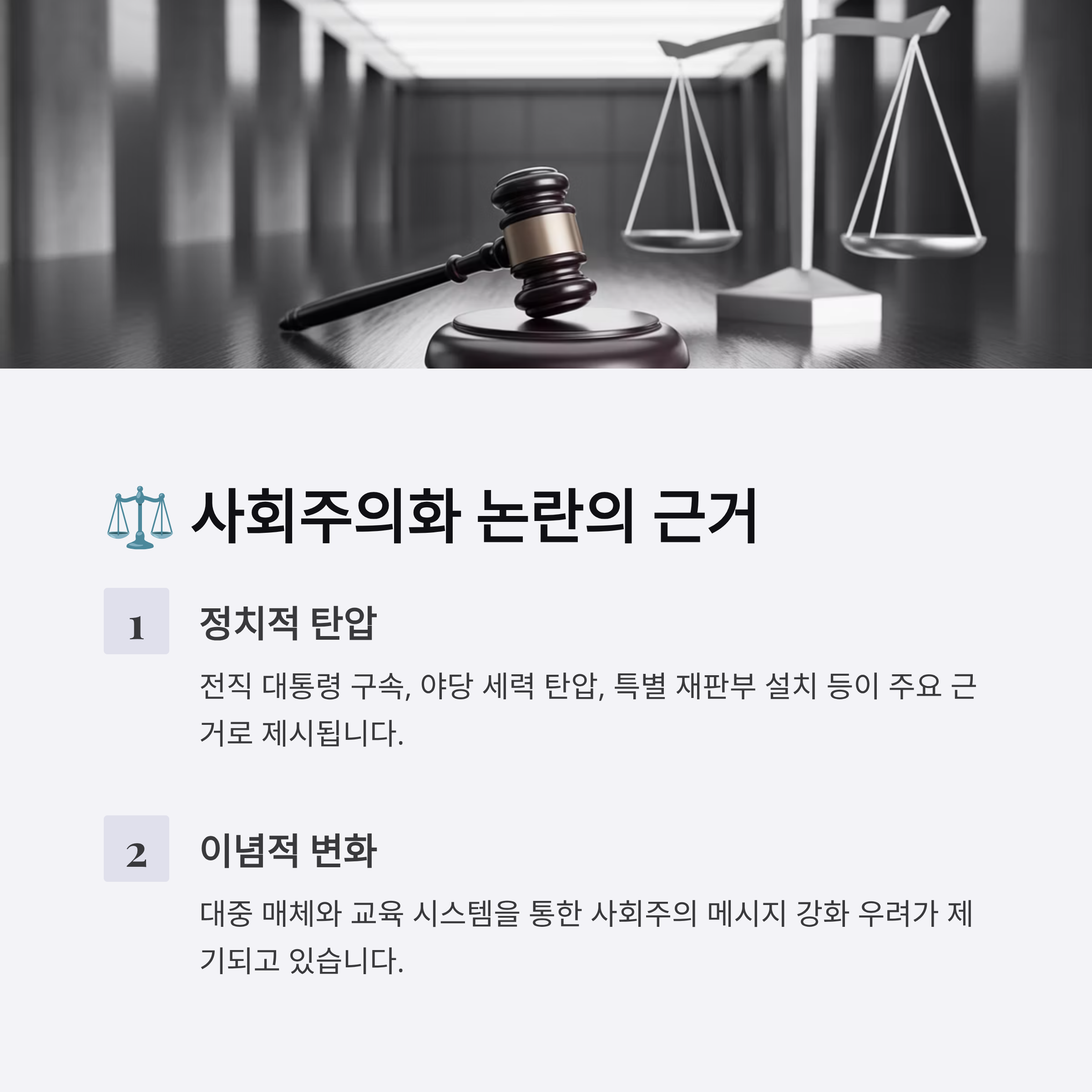 2025년 현재, 대한민국 내부적으로 체제 변화와 관련된 논란이 심화되고 있습니다. 미국의 우익 인사들은 한국이 사회주의 또는 공산주의 체제로 전환되고 있다는 주장을 내놓으며, 이를 뒷받침하는 수많은 정책 사례와 현재의 지정학적 상황에 대한 분석을 강조하고 있습니다.