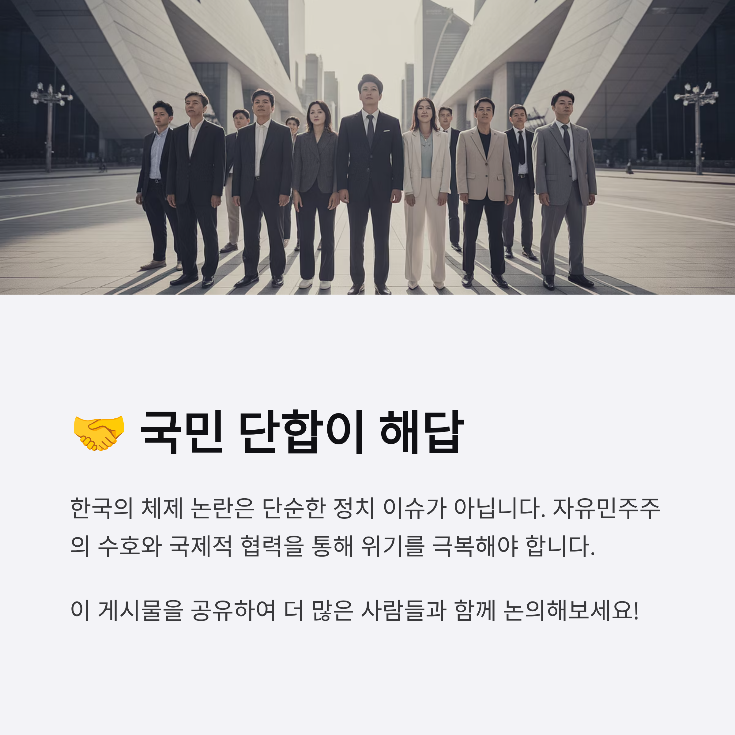 한국의 체제 변화 논란은 단순한 정치적 이슈가 아니라 국가 체제의 미래와 국제 사회 내에서의 입지를 대변하는 중요한 문제입니다. 논란이 길어질수록 내부적 단합과 외부적 협력이 모두 약화될 가능성이 있습니다. 한국 내부에서는 자유 민주주의의 정체성을 지키기 위한 법적, 제도적 조치가 시급하며, 여론의 다각적인 수렴이 필요합니다.