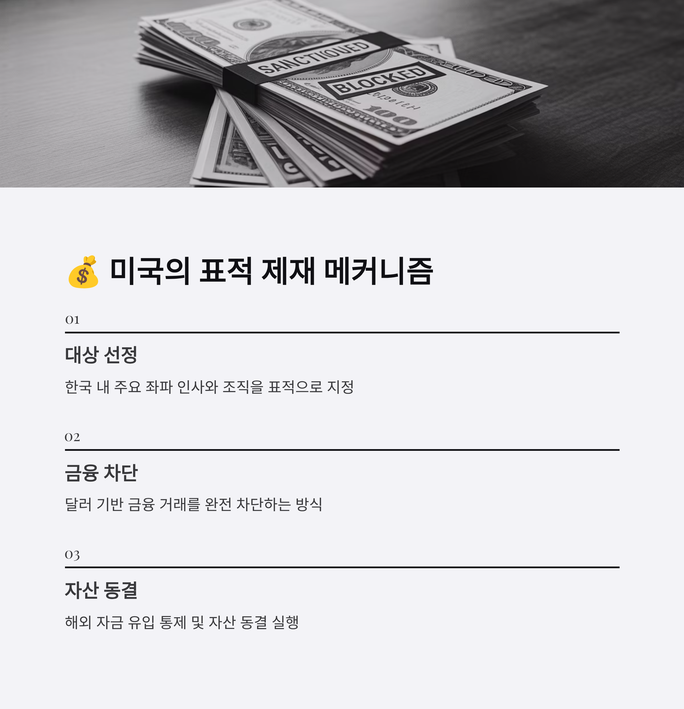 | A. 미국은 표적 제재를 통해 좌파 세력의 영향력을 줄이고, 금융 거래를 실질적으로 차단하여 한국 내 민주주의 체제의 안정을 유지하고자 합니다. 이는 국제 금융망 고립이라는 결과를 초래할 수 있습니다. |