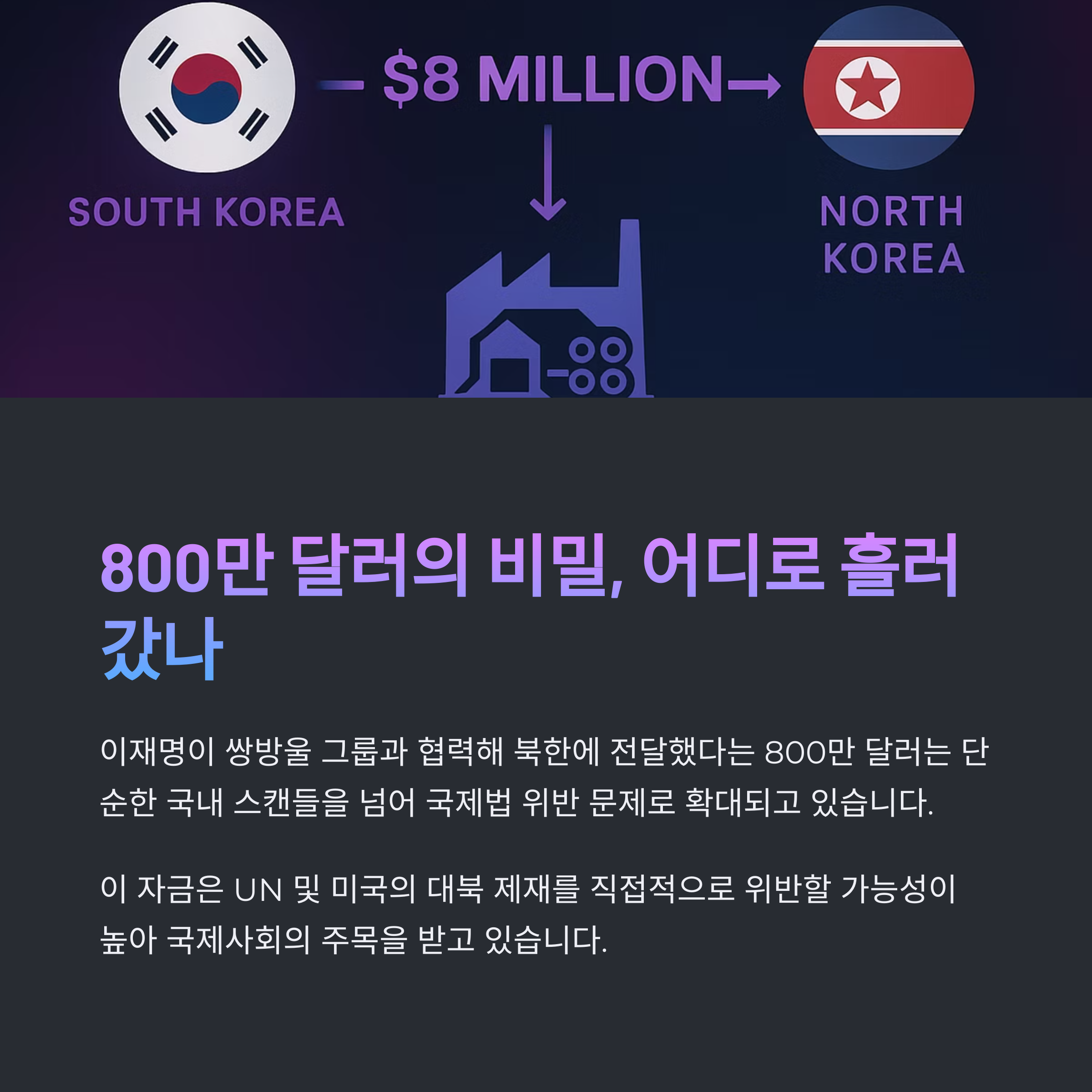 특히 이재명이 쌍방울 그룹과 협력해 북한에 전달한 800만 달러는 단순한 국내 범죄를 넘어 국제적인 위반 사안으로 확대될 수 있어, 한국은 물론 국제 사회의 추가적인 주목을 받고 있습니다. 이번 글에서는 이와 관련된 주요 사건과 그 파급 효과, 그리고 이에 따른 미국 및 UN의 향후 대응 가능성을 다룹니다.