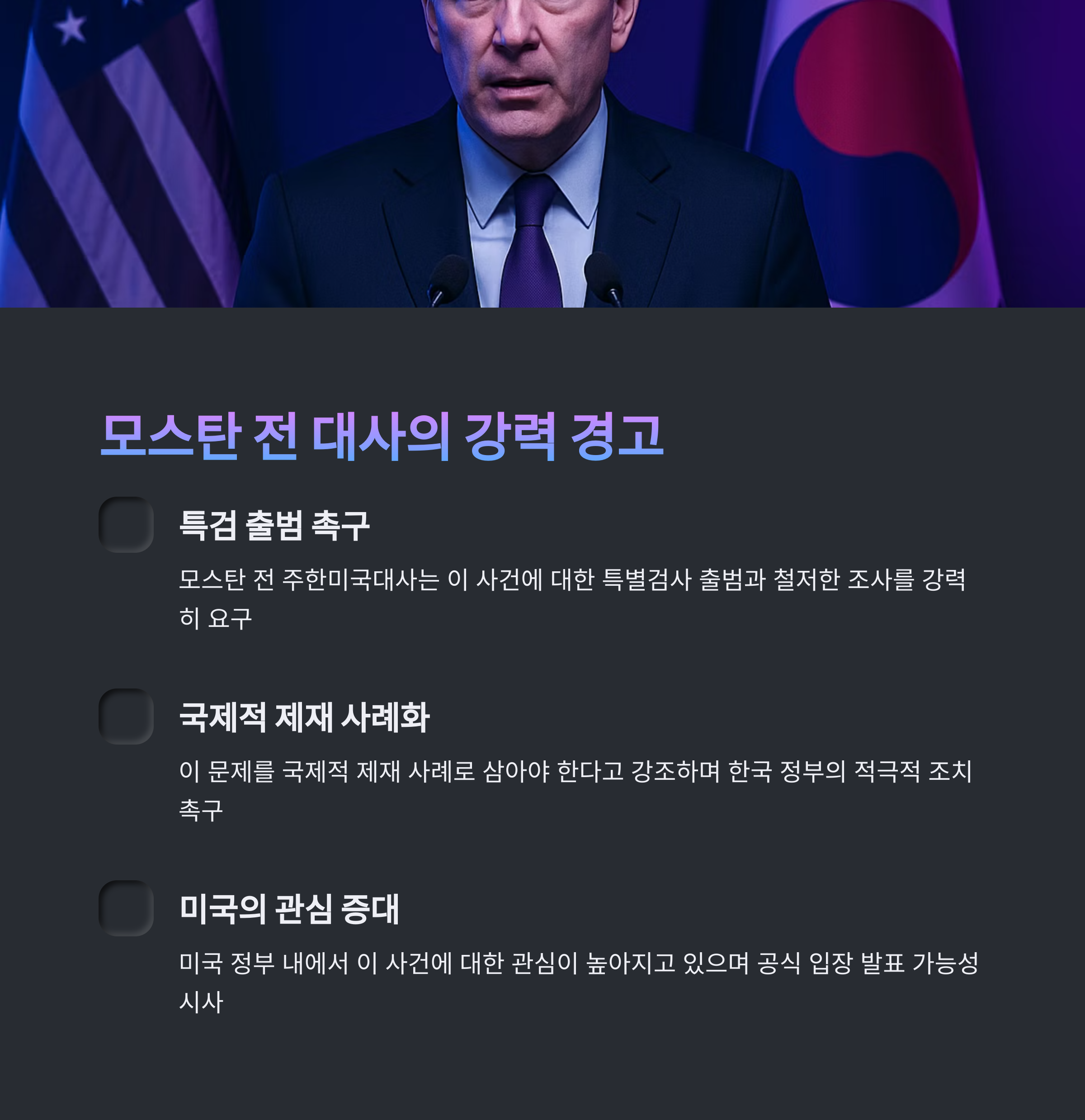 4. 모스탄 전 주한미국대사는 특검 출범 및 조사를 촉구하며, 이를 국제적 제재 사례로 삼아야 한다고 강조했습니다.