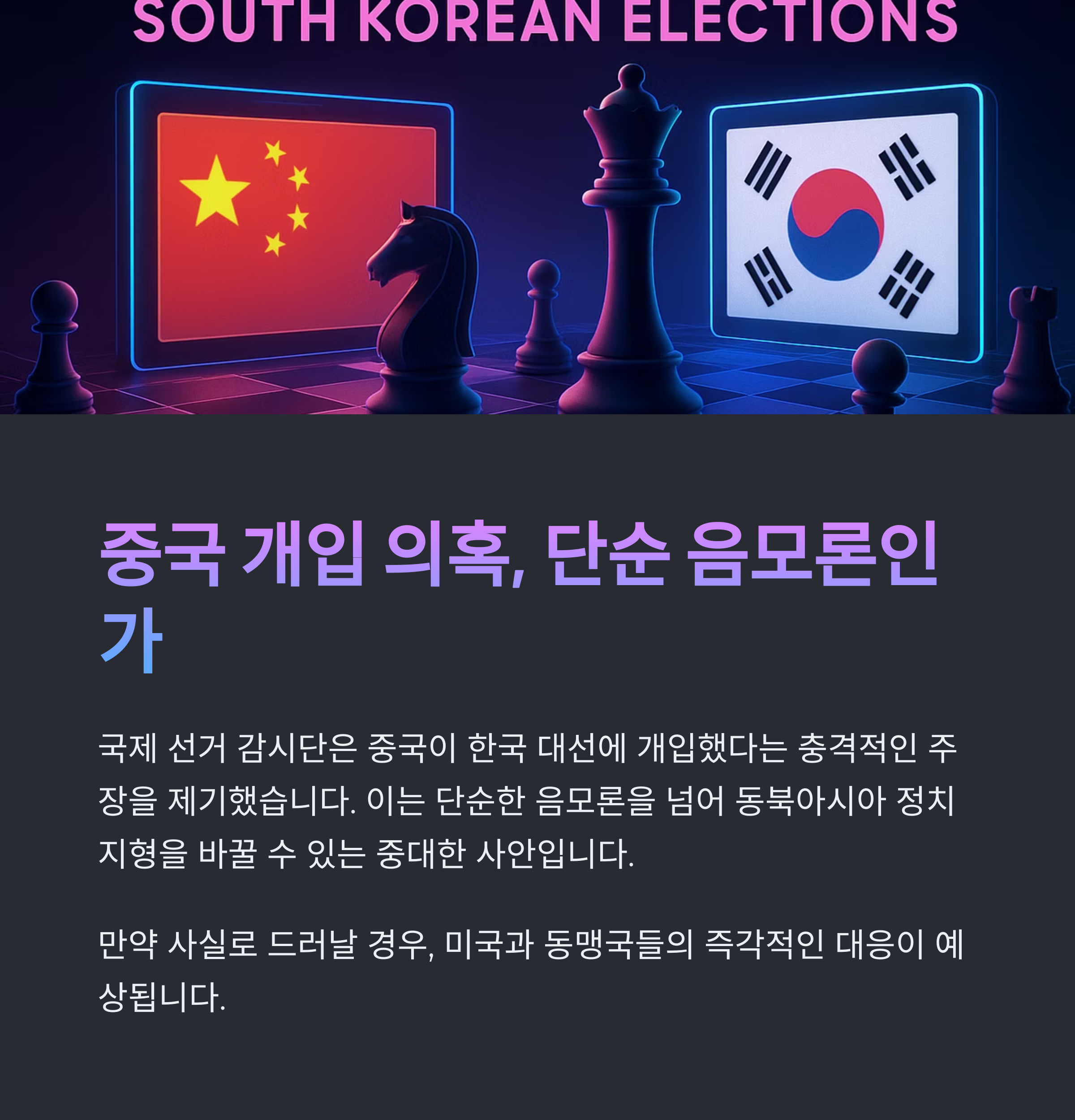1. 국제 선거 감시단은 한국의 6.3대선에서 부정 선거 개입이 있었다고 주장하고, 중국을 배후로 지목했습니다.
