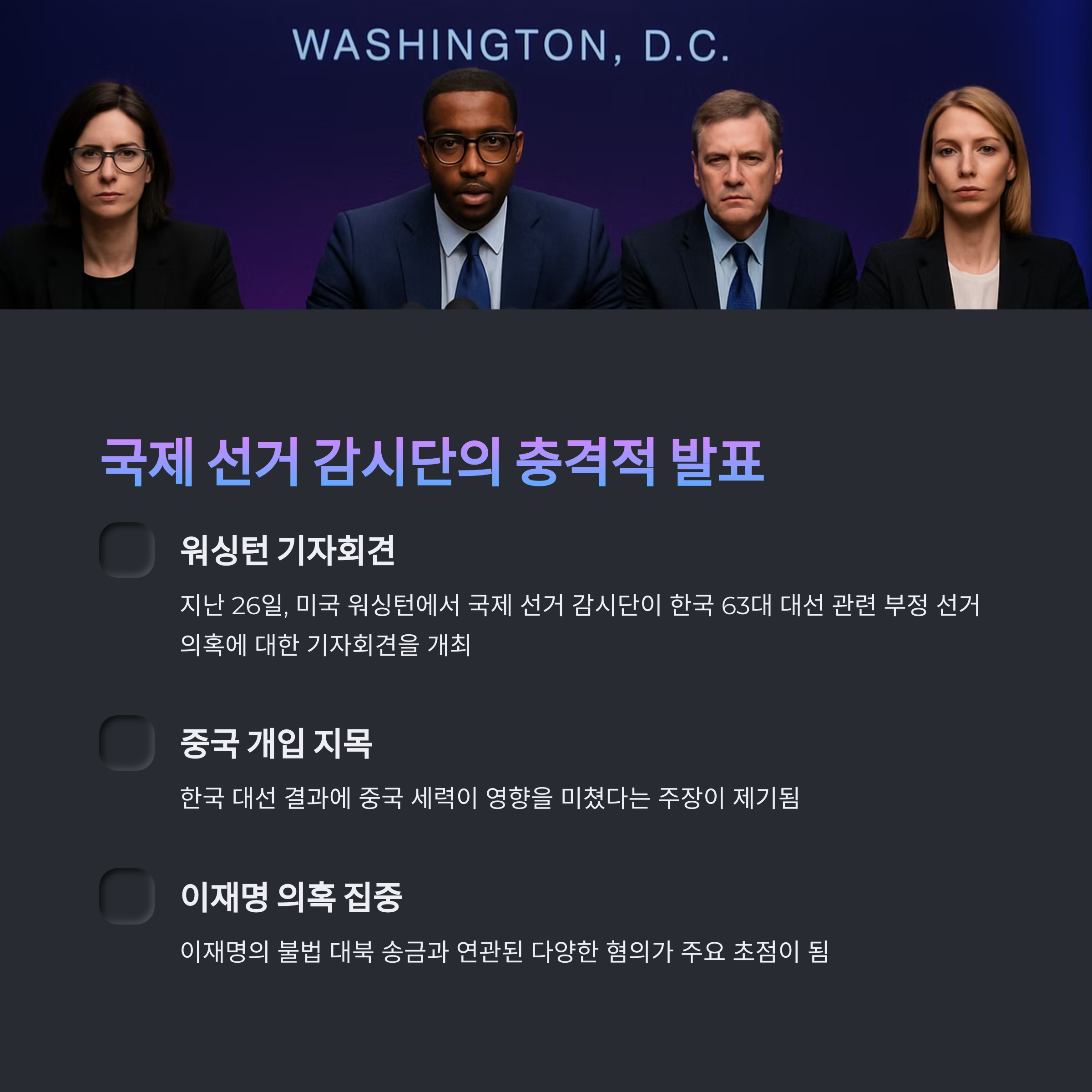 지난 26일, 미국 워싱턴에서 국제 선거 감시단이 한국의 63대 대선 관련 부정 선거 의혹에 대한 기자회견을 열었습니다. 이번 회견의 주요 초점은 중국 세력이 한국 대선 결과에 영향을 미쳤다는 주장과, 주요 정치인 이재명에 대한 의혹으로 귀결되었습니다. 이들의 주요 발언은 이재명의 불법 대북 송금과 연관된 다양한 혐의를 다루며, 이 사건이 유엔(UN) 및 미국의 대북 제재를 직접적으로 위반할 가능성을 제기했습니다.