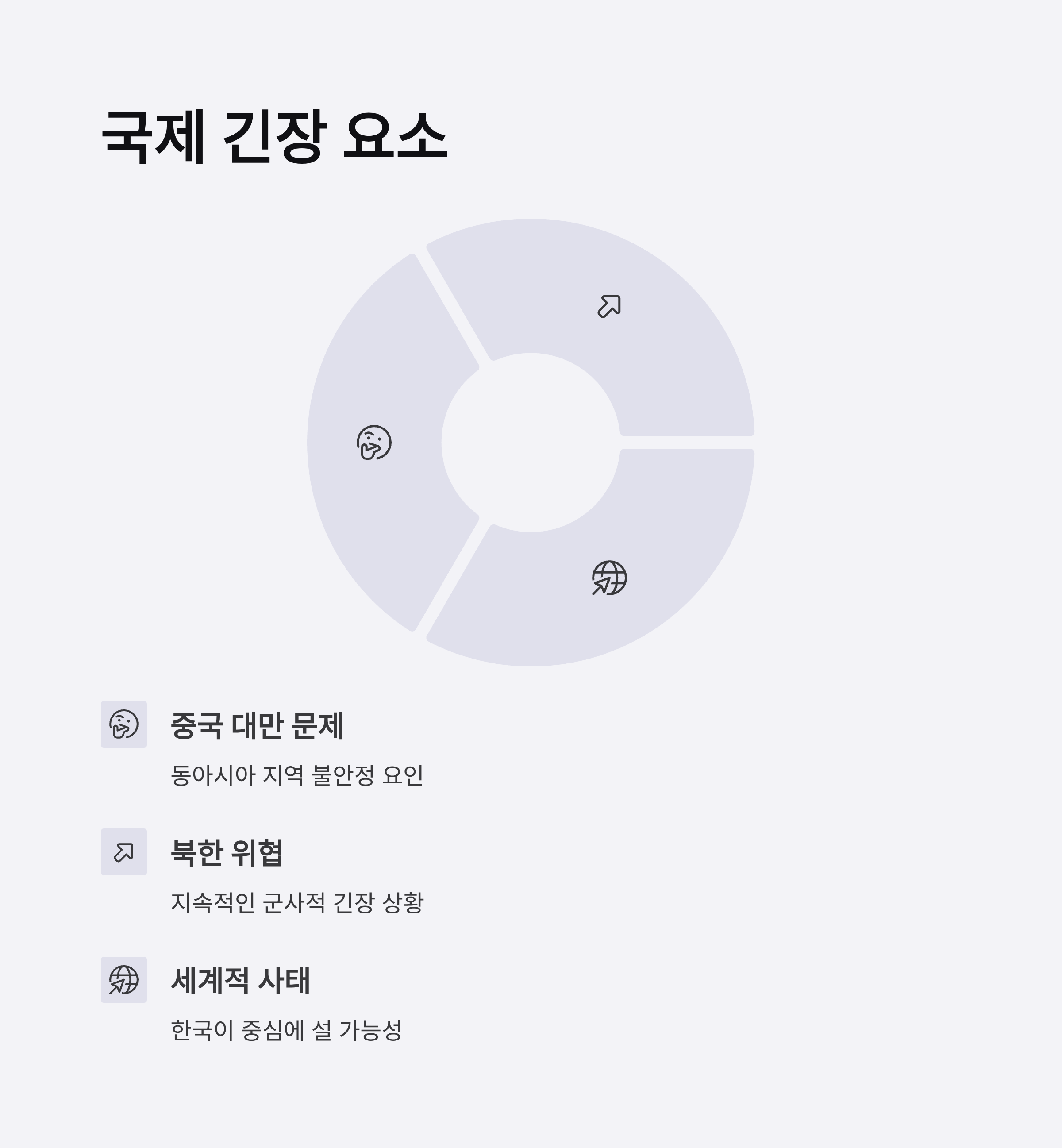 그는 또한 트럼프 정부와 이재명 정권 간의 경제적 제재 가능성을 제기하며 한국 경제가 대규모 위기에 처할 수 있음을 경고했습니다. 특히 중국의 대만 문제, 북한의 위협 등 국제적인 긴장 요소와 맞물려 한국이 세계적인 사태의 중심에 설 가능성도 언급했습니다.