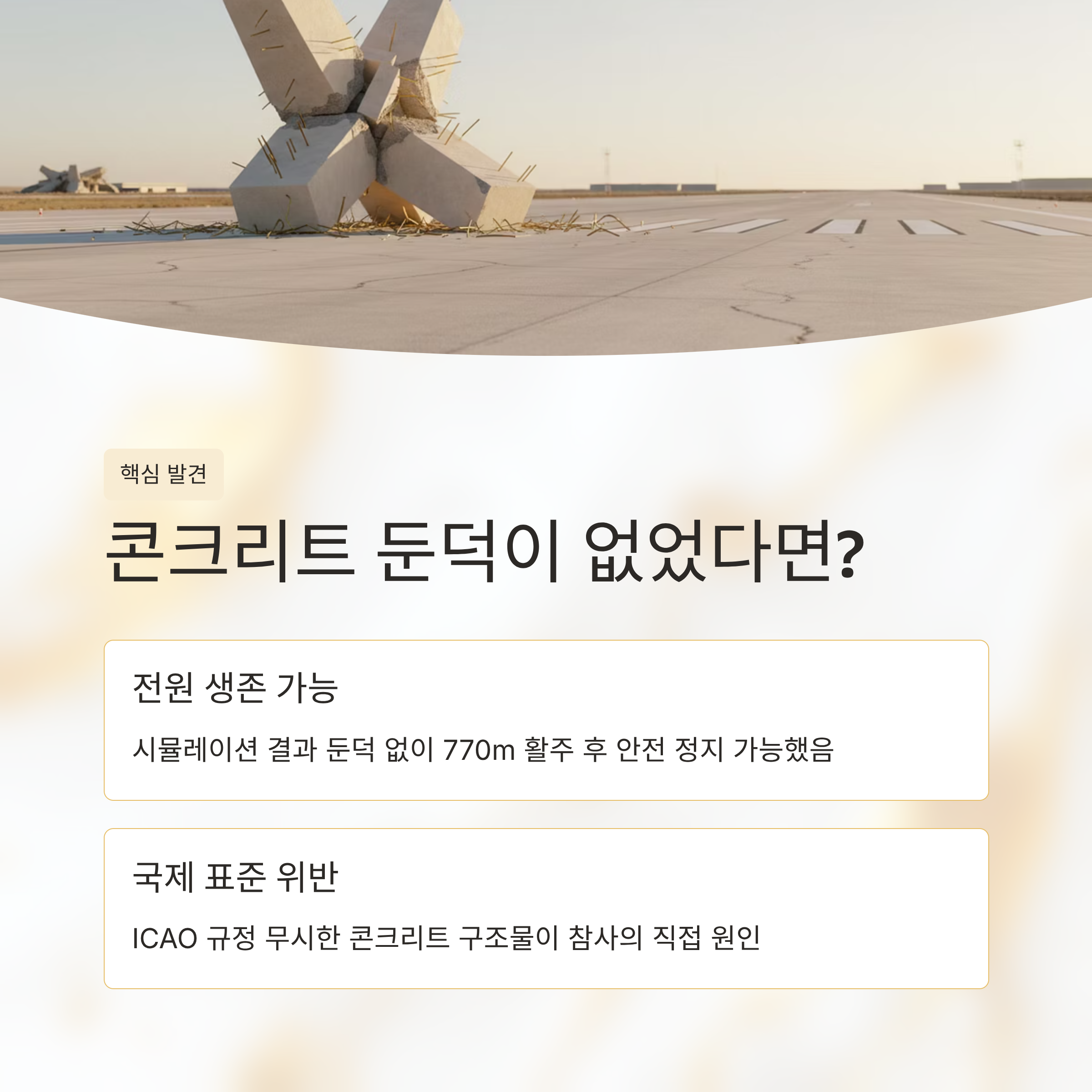 첫째, 시뮬레이션 결과 공항 내 콘크리트 둔덕이 없었다면 탑승자 전원이 생존 가능했다는 충격적인 사실이 밝혀졌습니다.