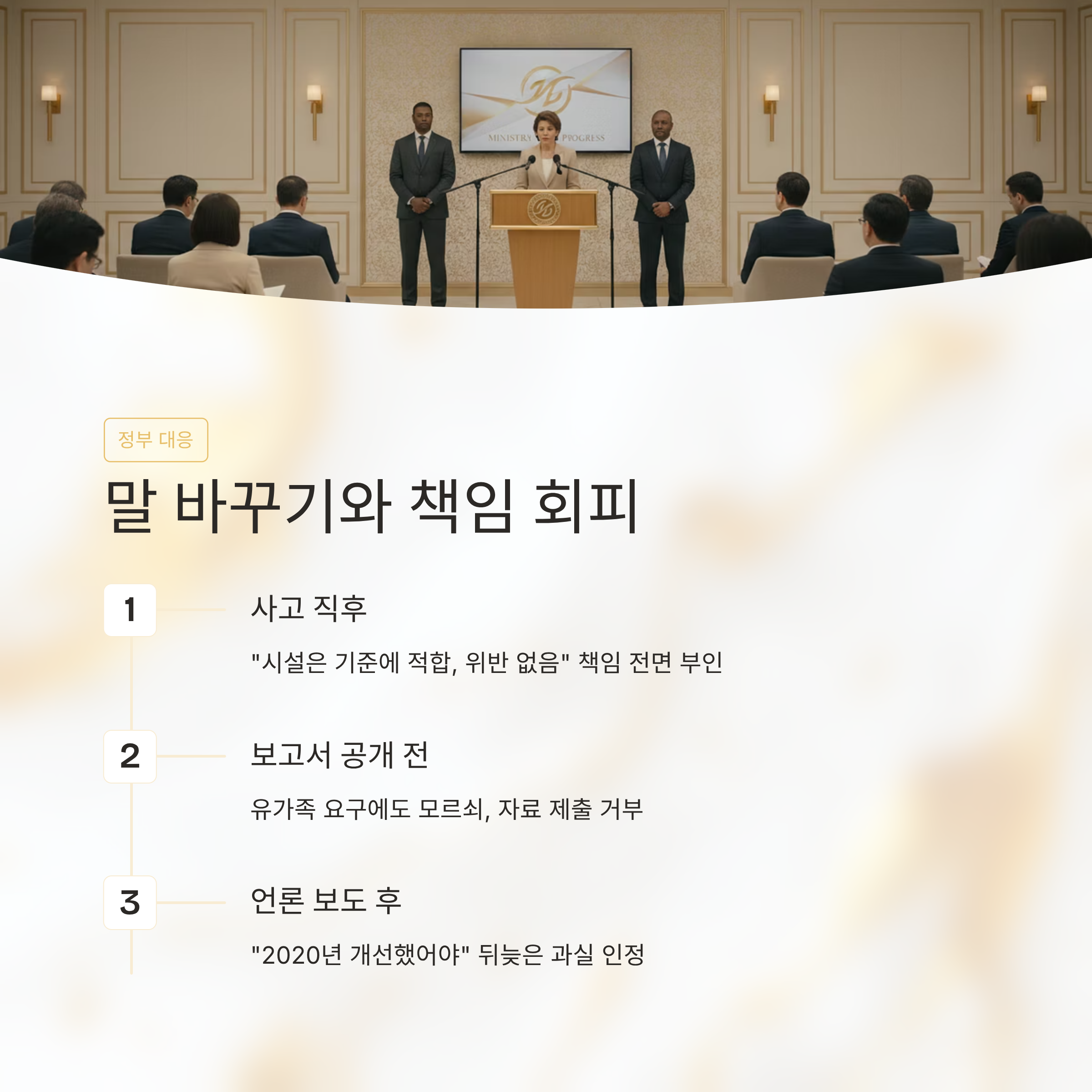 보고서 내용만큼이나 국민적 공분을 사는 것은 정부의 이중적인 태도입니다. 국토교통부는 불과 지난달까지만 해도 국민권익위원회 등을 통해 "해당 시설은 설치 기준에 적합하며 위반 시설이 아니다"라며 책임을 전면 부인했습니다. 유가족들의 절규와 진상규명 요구에도 모르쇠로 일관하며 오히려 큰소리를 치던 정부가, SBS와 국민의힘을 통해 보고서의 존재와 내용이 만천하에 드러나자 그제야 태도를 바꾼 것입니다. 국토부는 "2020년 시설 개량 당시 개선했어야 했는데 아쉽다"며 처음으로 과실을 인정하는 듯한 입장을 보였지만, 이는 진정성 있는 사과라기보다 여론에 떠밀린 '꼬리 자르기'라는 비판을 피하기 어렵습니다.