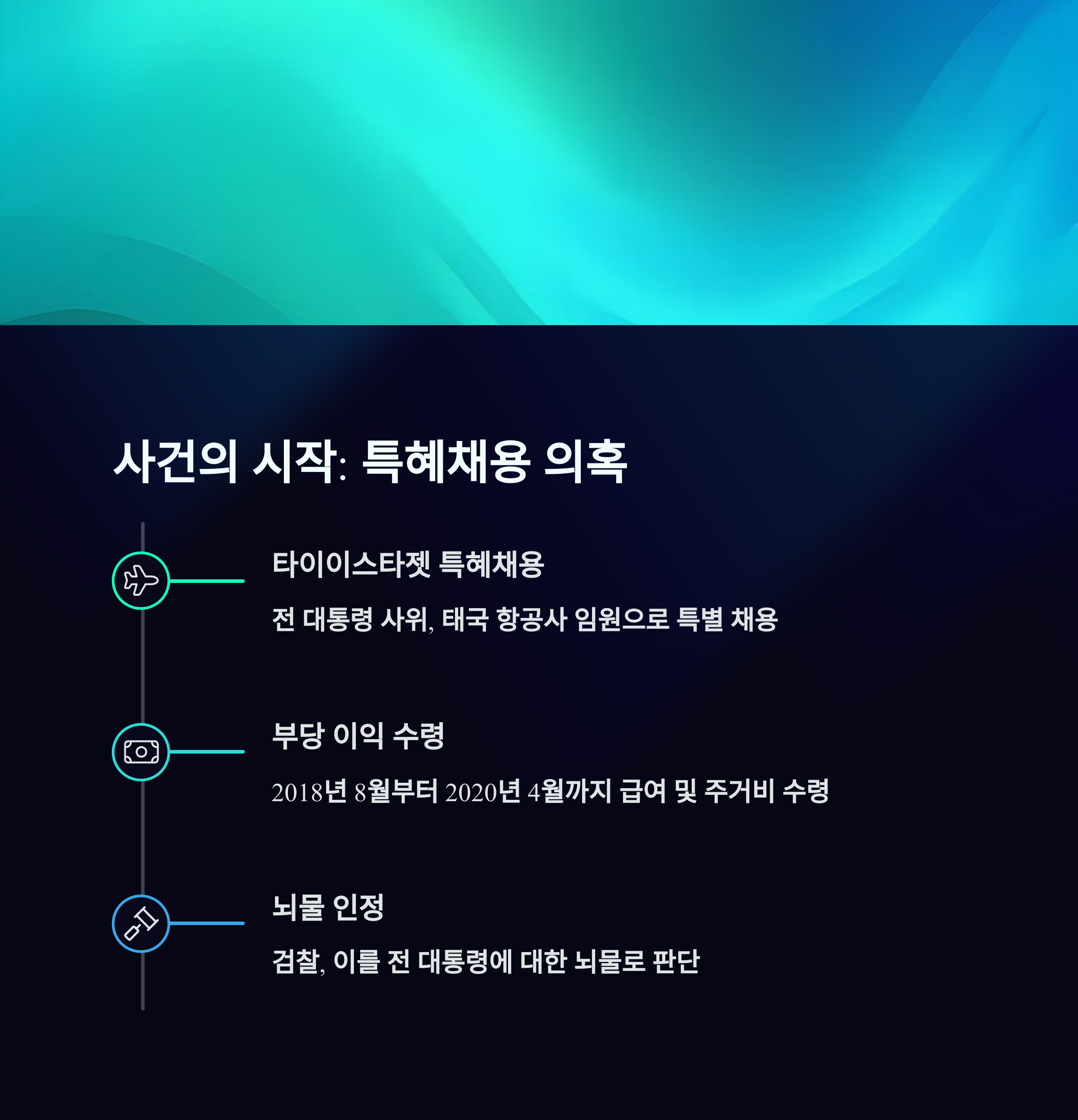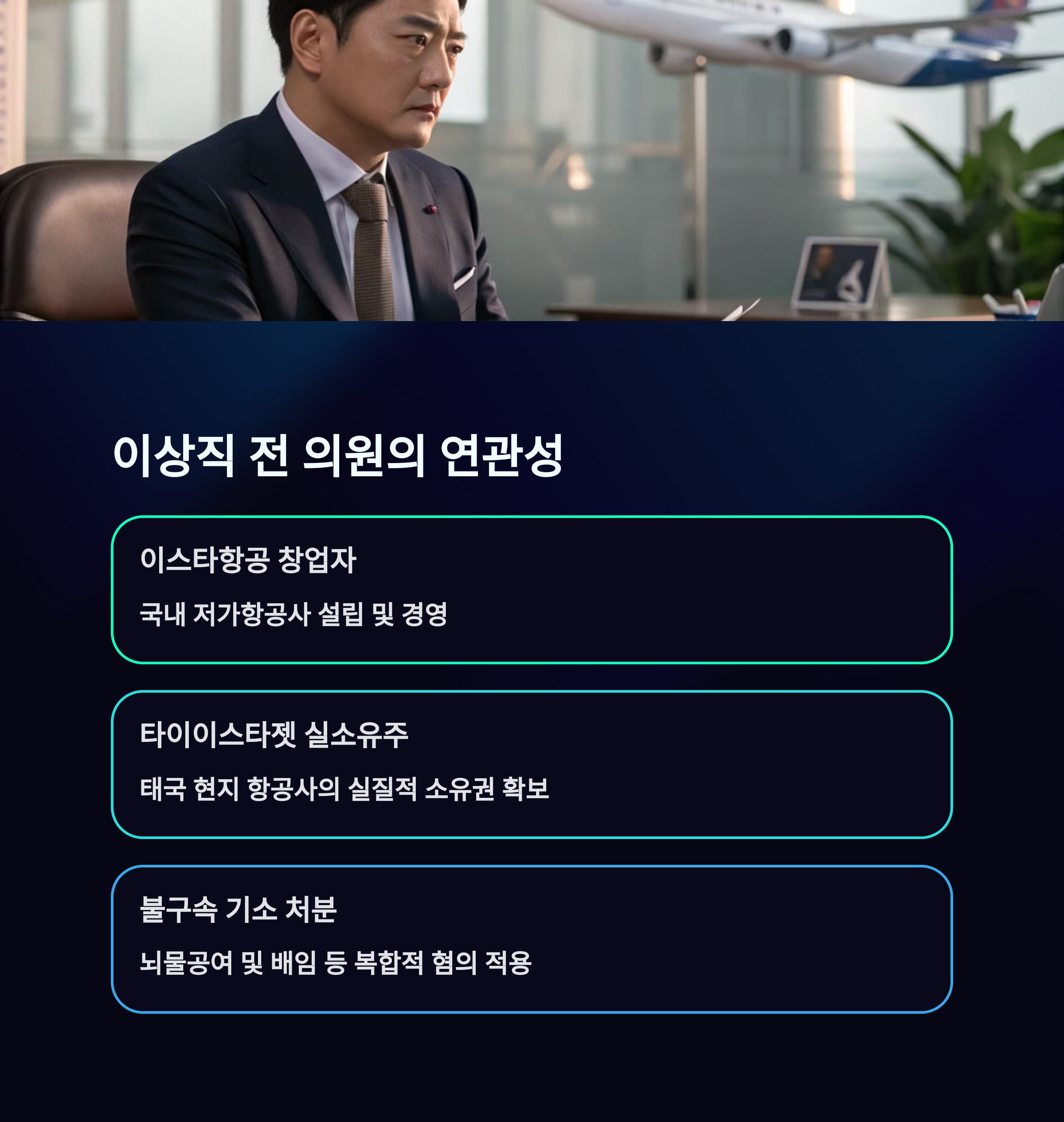 이스타항공 창업주 이상직 전 의원은 이미 재판에 회부된 상황으로, 이 사건 역시 그의 뇌물공여 및 업무상 배임 혐의와의 연관성을 고려하지 않을 수 없습니다. '타이이스타젯'과의 연계가 문 전 대통령의 사위 취업 과정에서 우대 조건으로 작용했다는 흔적이 있다면 이는 공직자와 연관된 범법 행위를 지적할 근거가 될 수 있습니다.