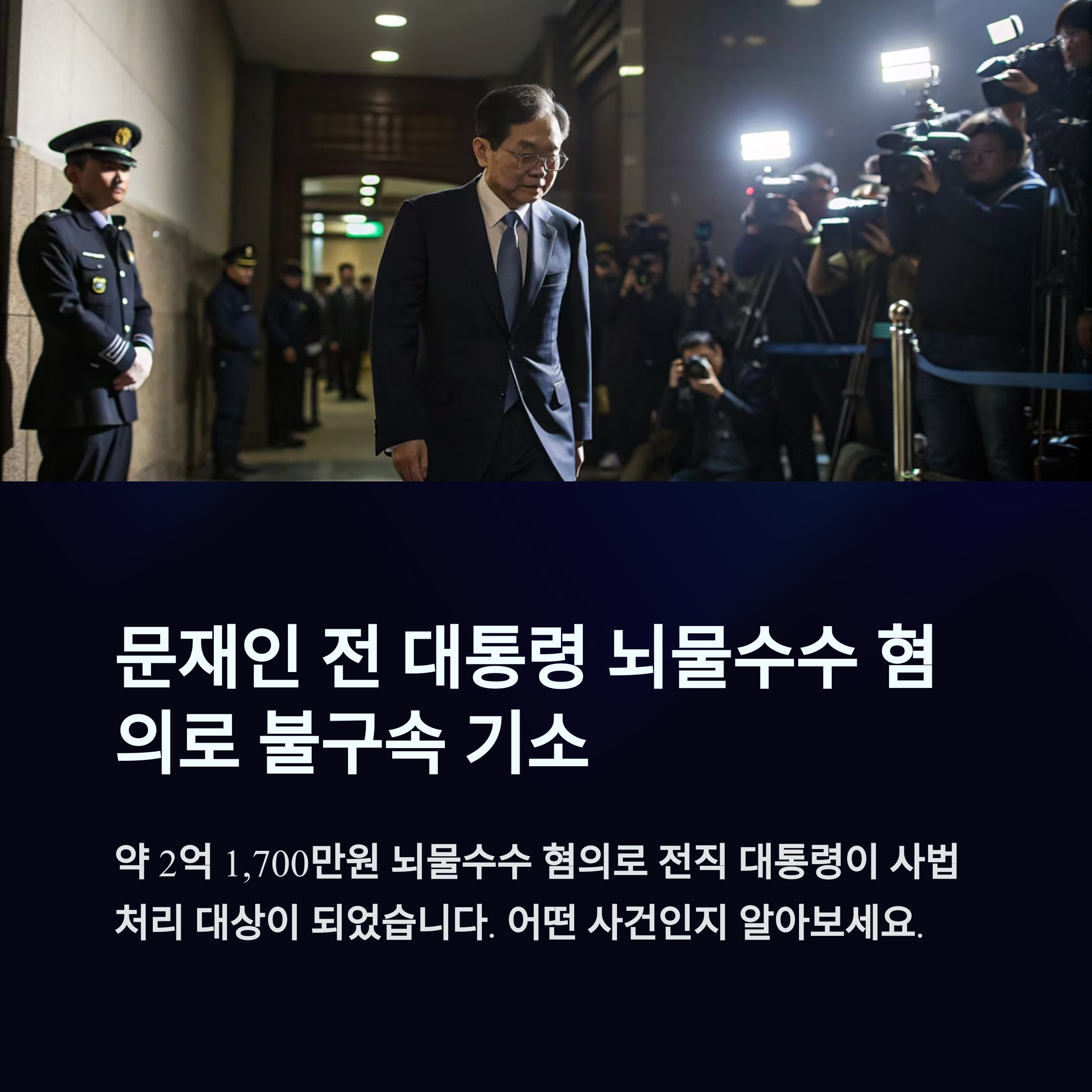 - 문재인 전 대통령이 약 2억 1,700만 원의 뇌물 수수 혐의로 불구속 기소되었습니다.