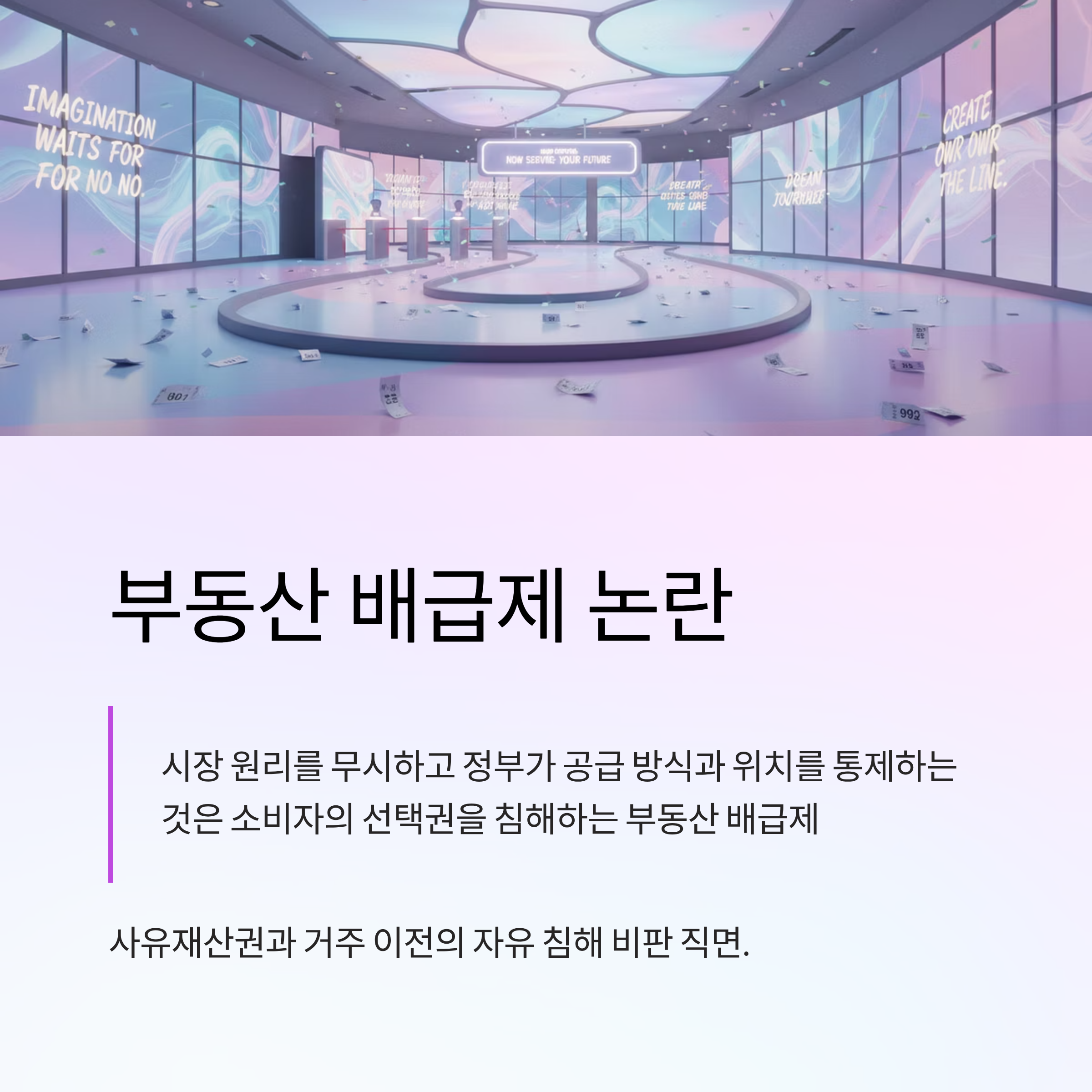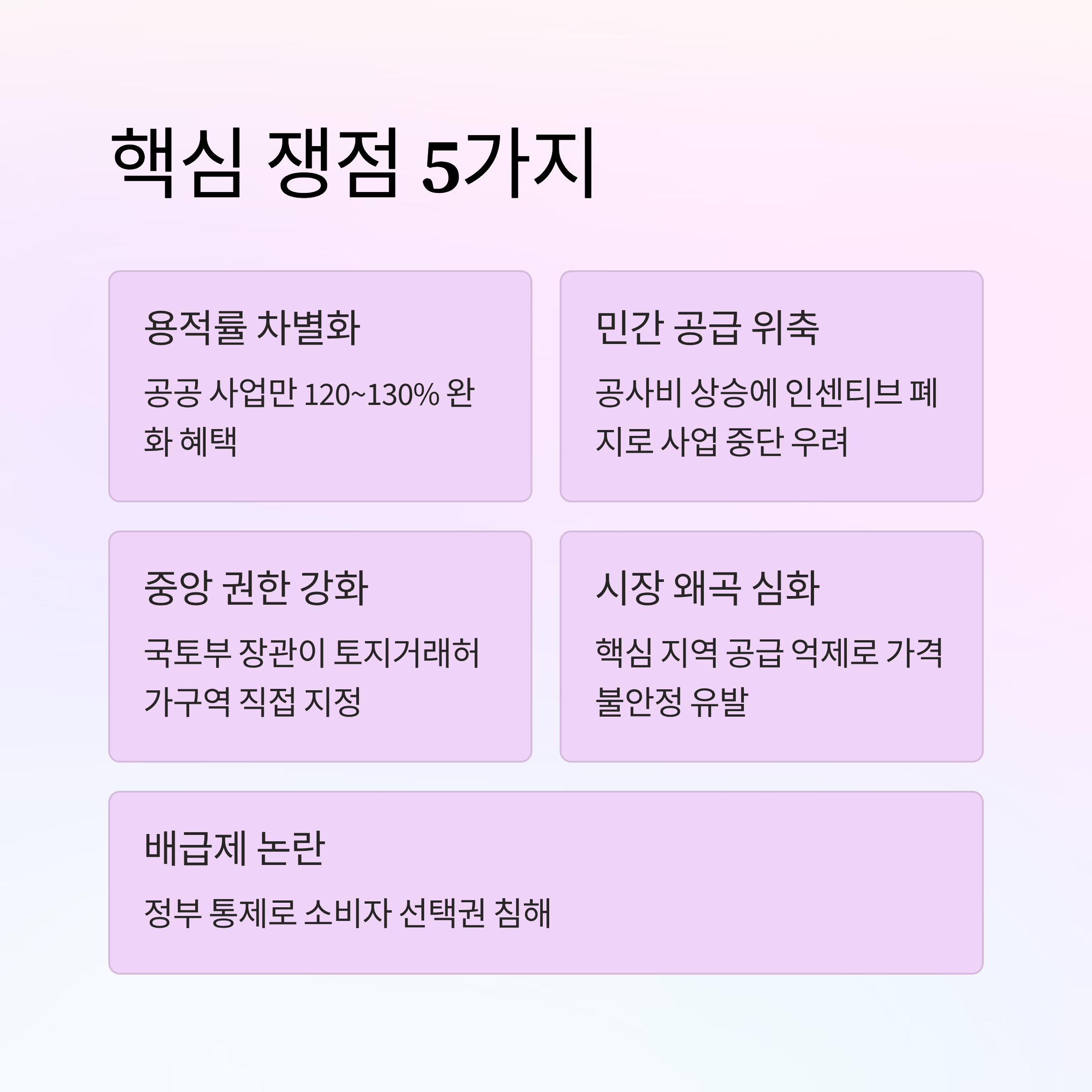 - 사실상의 부동산 배급제 논란: 시장 원리를 무시하고 정부가 공급 방식과 위치를 통제하는 것은 소비자의 선택권을 침해하는 '부동산 배급제'라는 비판에 직면했습니다.