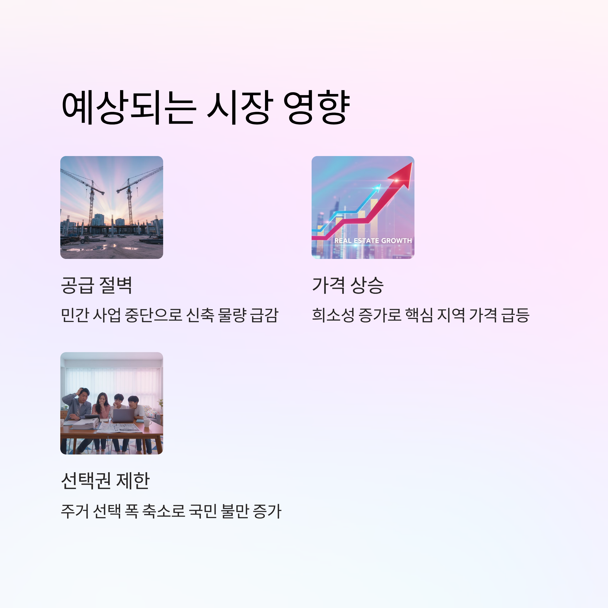 | A3. 정부는 가격 안정을 기대하지만, 시장 전문가들은 정반대의 결과를 우려합니다. 민간 공급이 막히면 서울 핵심 지역 신축 아파트의 희소성이 커져 오히려 '똘똘한 한 채' 쏠림 현상이 심화되고 가격이 상승할 가능성이 높습니다. 또한, 공공 임대 위주의 공급은 매매 수요를 충족시키지 못해 전반적인 주거 불안을 야기할 수 있습니다. |