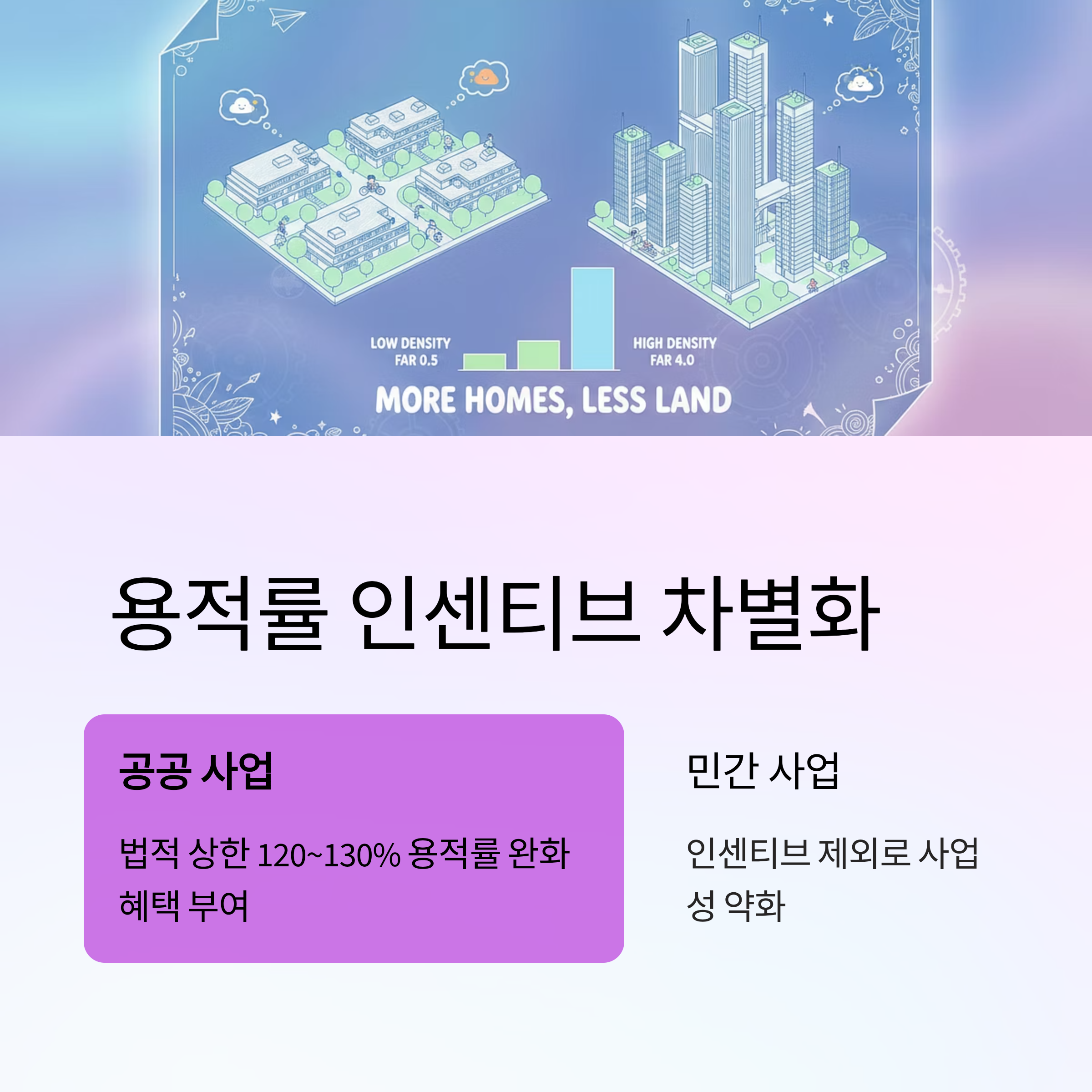 - 용적률 인센티브 차별화: 공공 시행 정비 사업에만 법적 상한의 120~130% 용적률 완화 혜택을 부여하고, 민간 사업은 제외하여 사업성을 약화시킵니다.