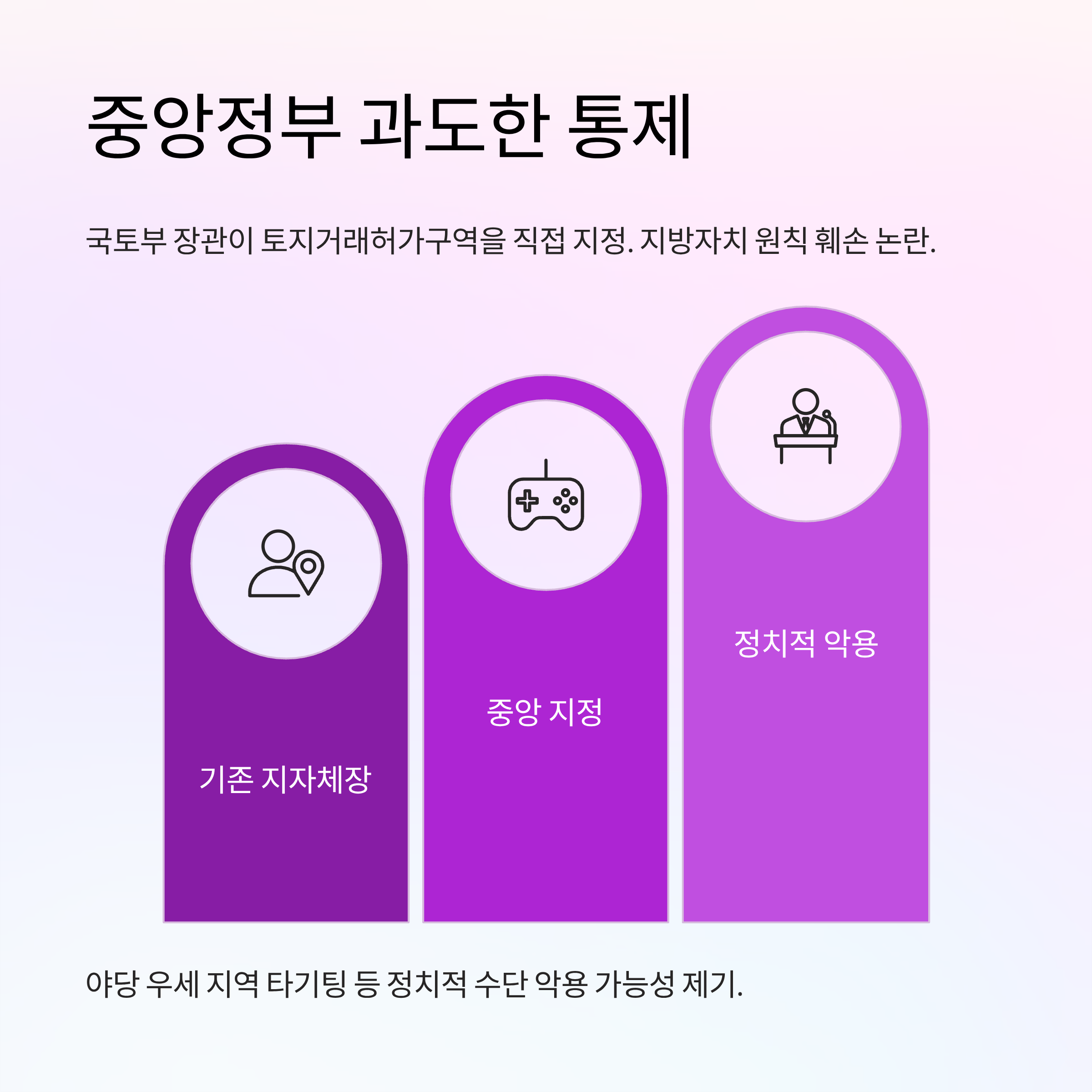 - 중앙정부 권한 강화: 국토부 장관이 지자체장 권한을 넘어 직접 '토지거래허가구역'을 지정할 수 있게 되어, 과도한 통제 및 정치적 악용 논란이 있습니다.
