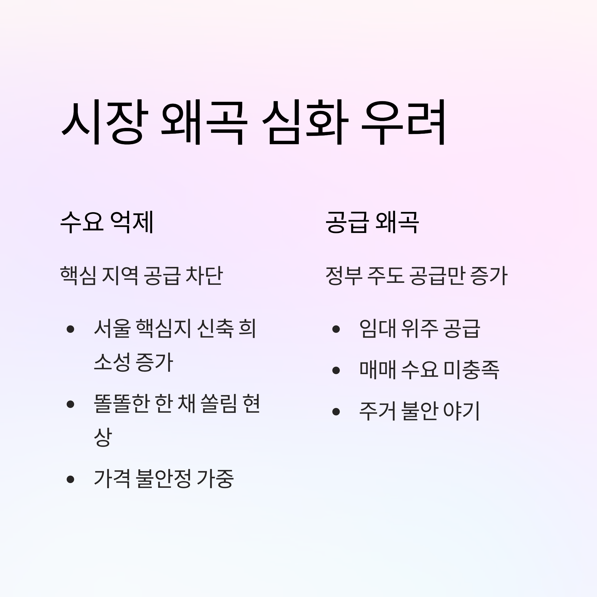 - 시장 왜곡 심화: 수요가 높은 핵심 지역의 공급은 억제하고 정부 주도 공급만 늘리는 정책은 '똘똘한 한 채' 선호 현상을 부추겨 가격 불안정을 유발할 수 있습니다.