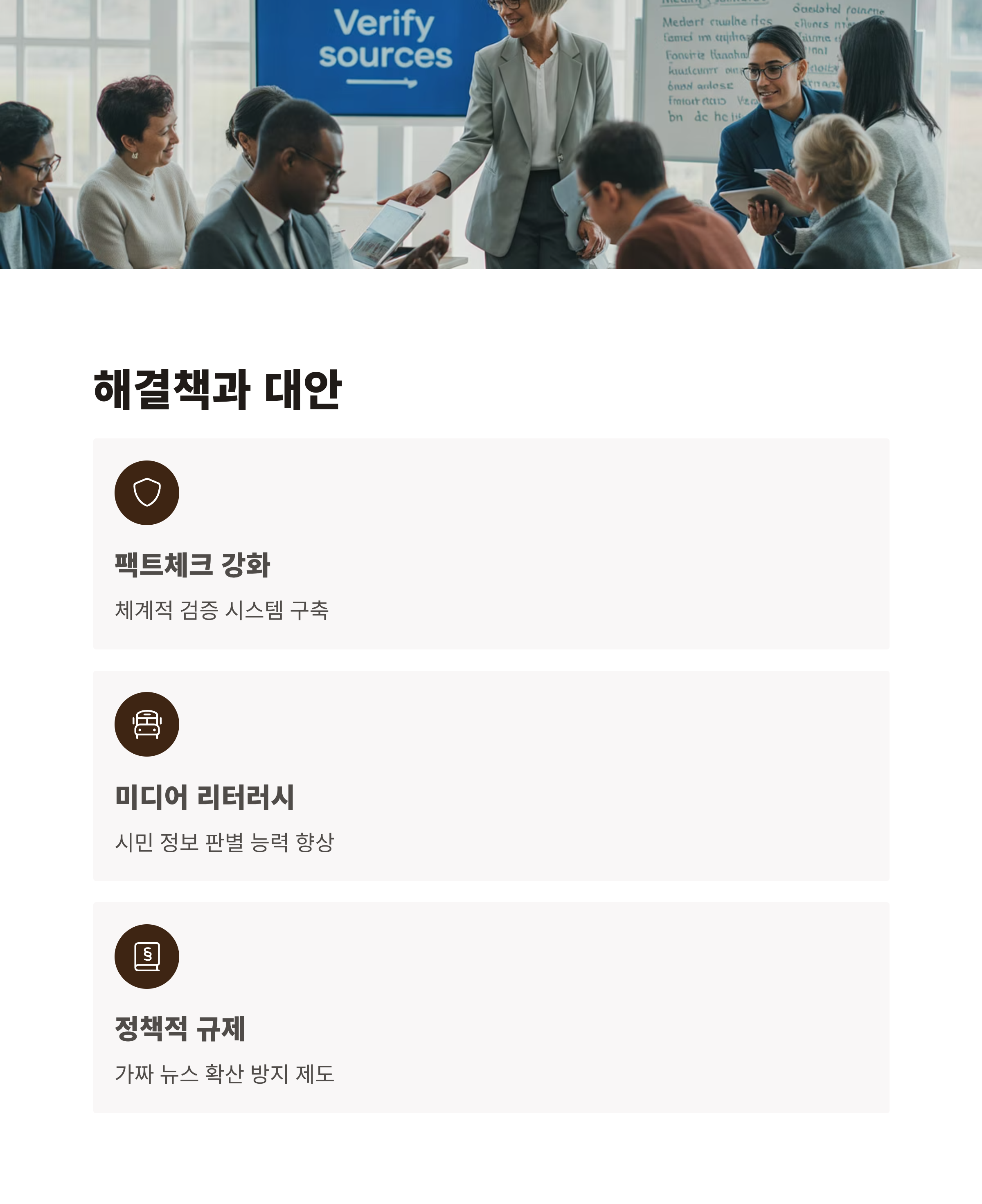 | A. 가짜 뉴스를 근절하기 위해서는 강력한 팩트 체크 시스템 구축, 잘못된 정보에 대한 신속한 조치를 포함한 내용 규제가 필요합니다. 또한, 플랫폼 기업들도 검증된 정보를 우선하도록 규정받아야 합니다. |