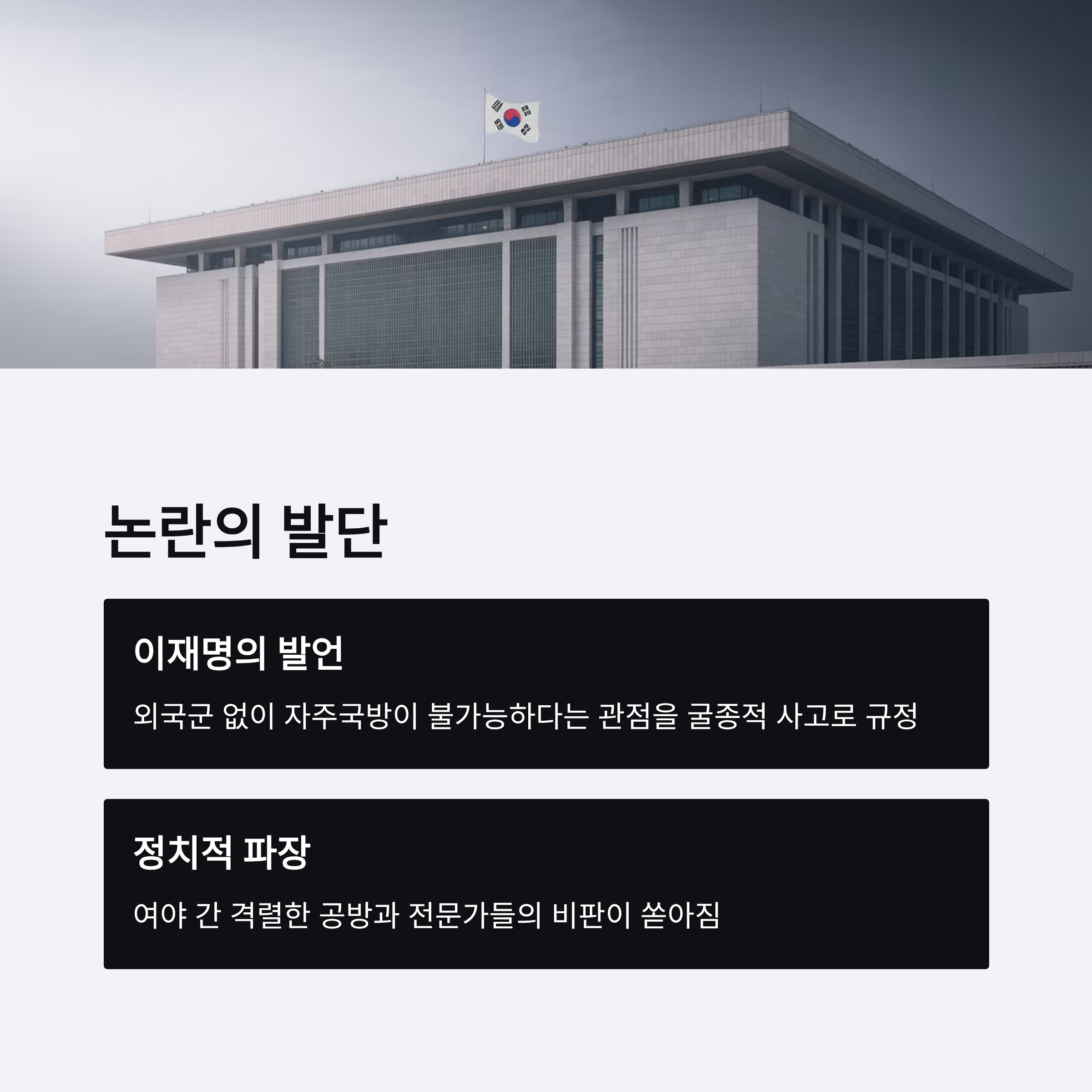- 이재명 대통령은 외국군 없이 자주국방이 불가능하다는 관점에 반대 의견을 피력하며, 이를 굴종적 사고로 규정해 논란을 촉발했습니다.