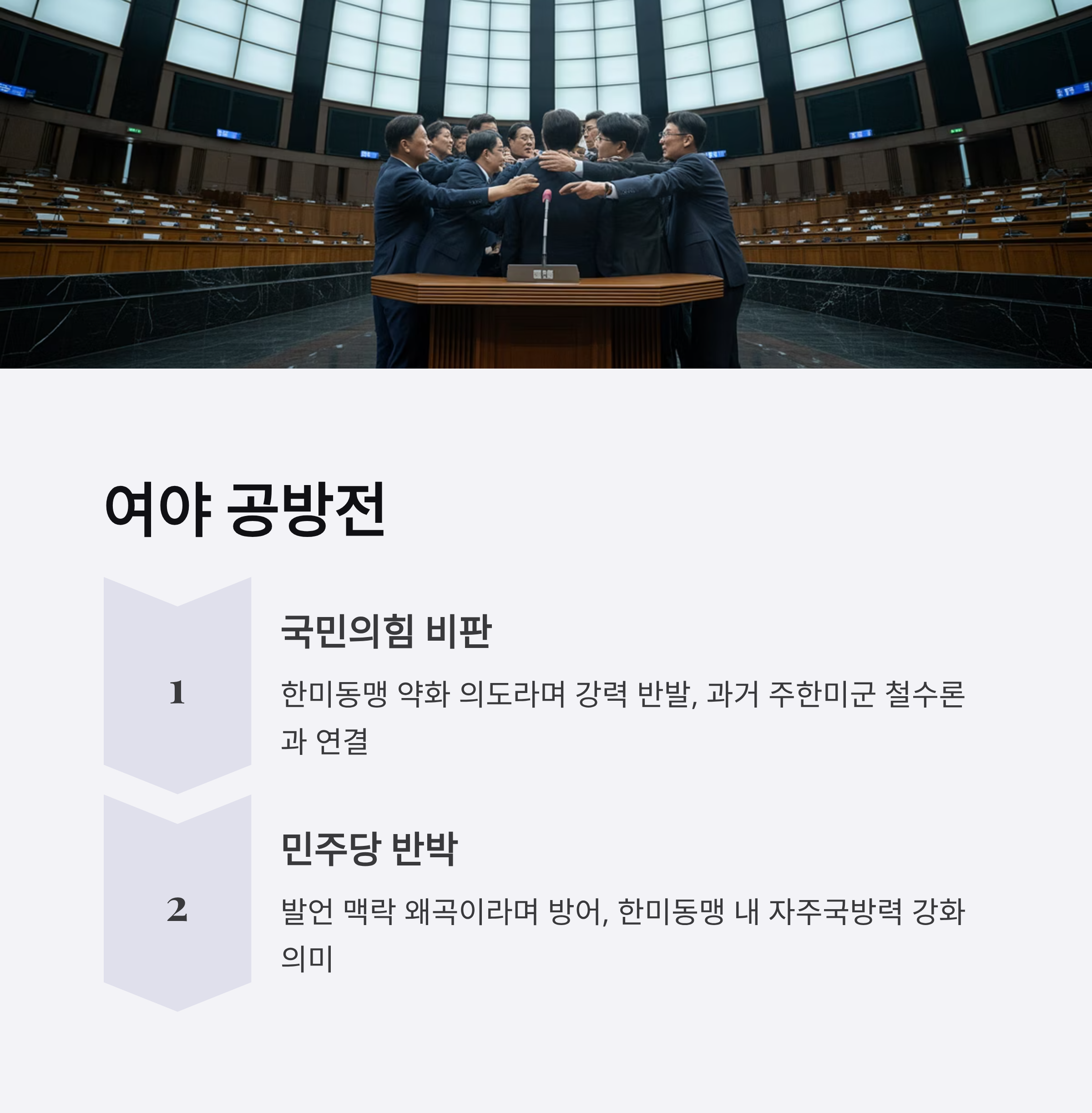 - 국민의힘은 이 발언이 한미동맹을 약화시키려는 의도가 있다고 비판했으며, 민주당은 이를 부인하는 입장을 밝혔습니다.