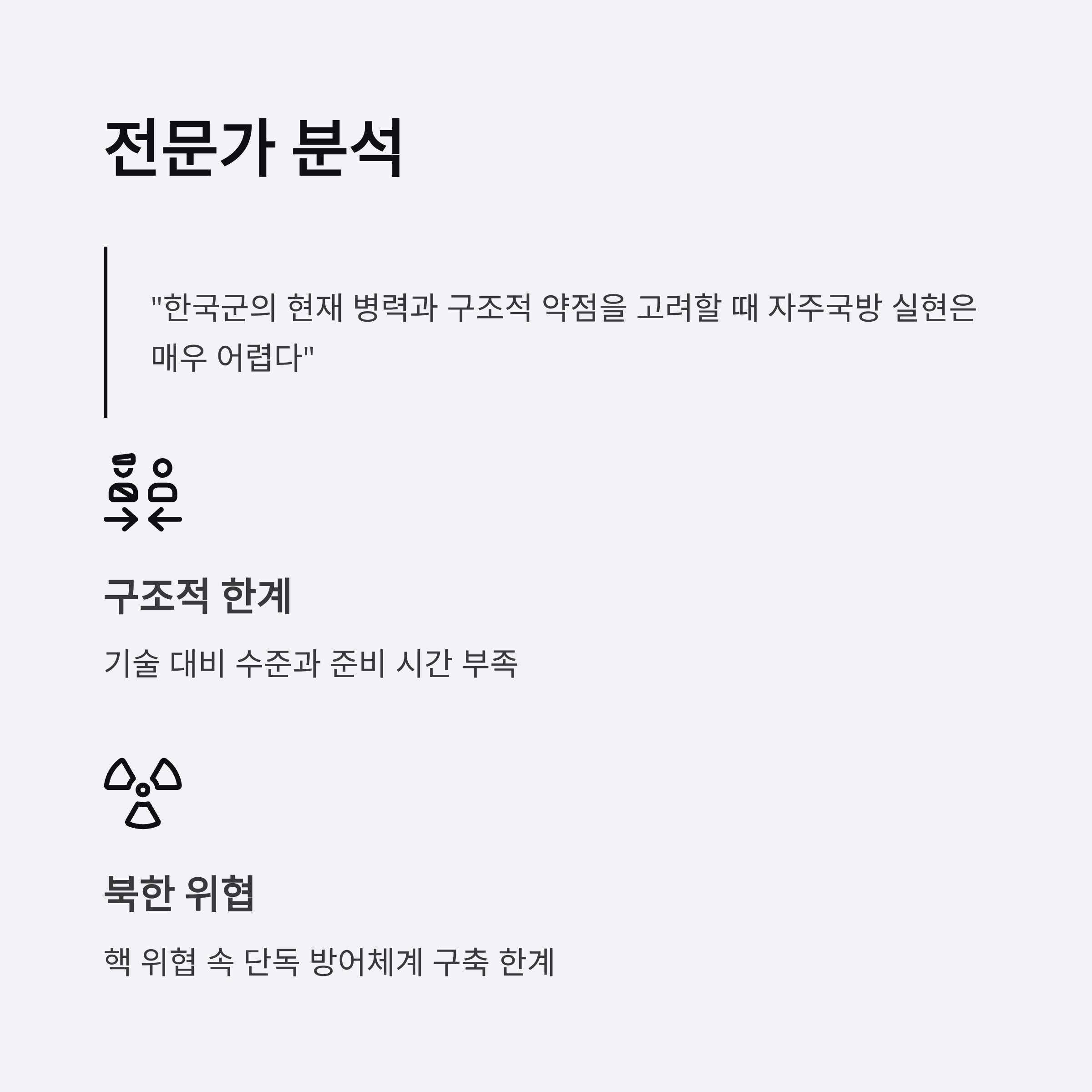 - 군사 전문가들은 한국군의 병력과 구조적 약점이 자주국방을 어렵게 만든다고 분석하며, 이 발언이 현실과 맞지 않다고 지적했습니다.