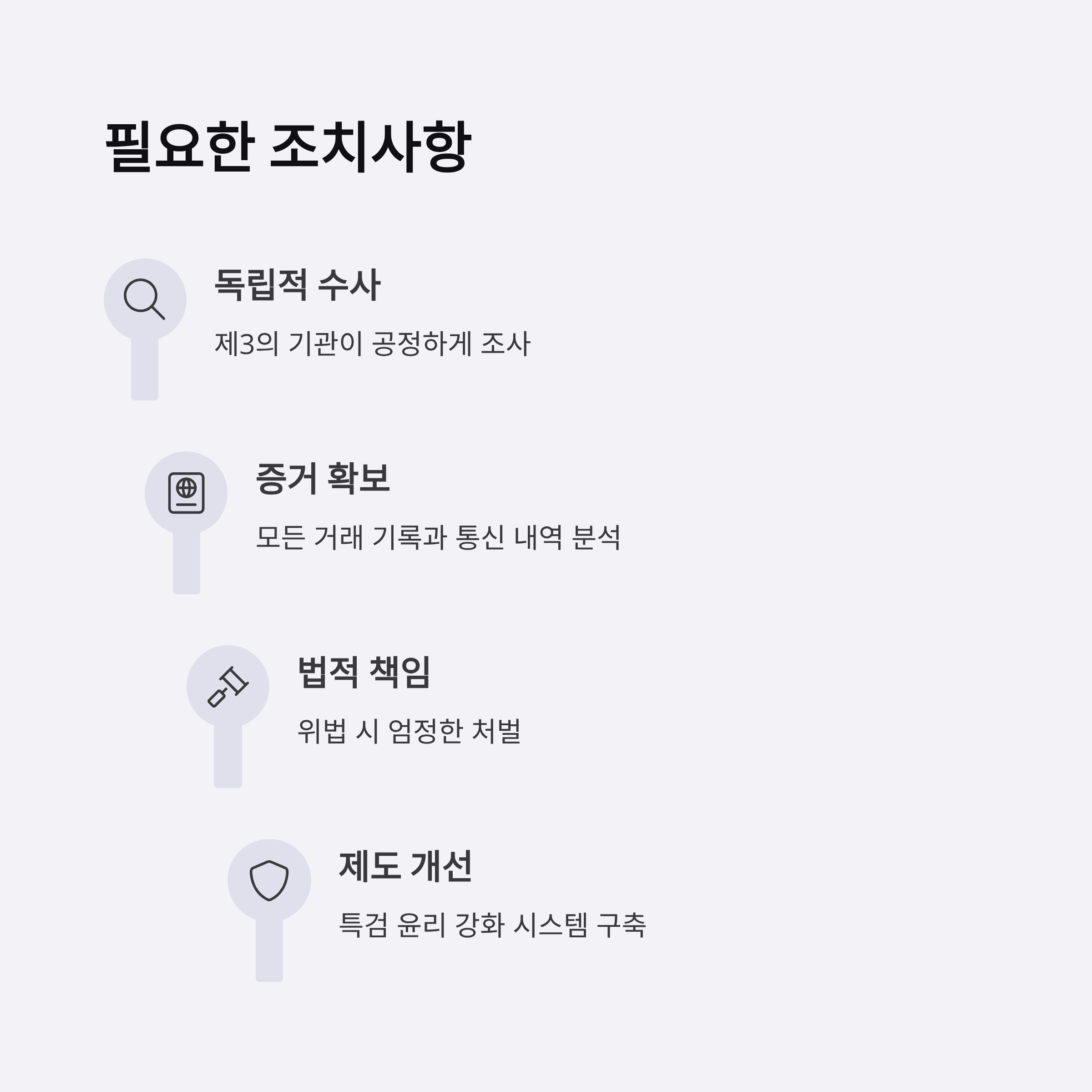 사건의 올바른 처리를 통해 공직자가 사익 추구를 위해 공적 신뢰를 져버리지 않도록 해야 합니다. 만일 제기된 모든 의혹이 해소되지 않는다면, 이는 대한민국의 법치주의와 경제 신뢰도에 부정적인 영향을 미칠 것입니다. 이러한 상황을 극복하기 위해 국민의 관심과 압박 속에서 철저한 진실 규명이 이루어져야 합니다.
