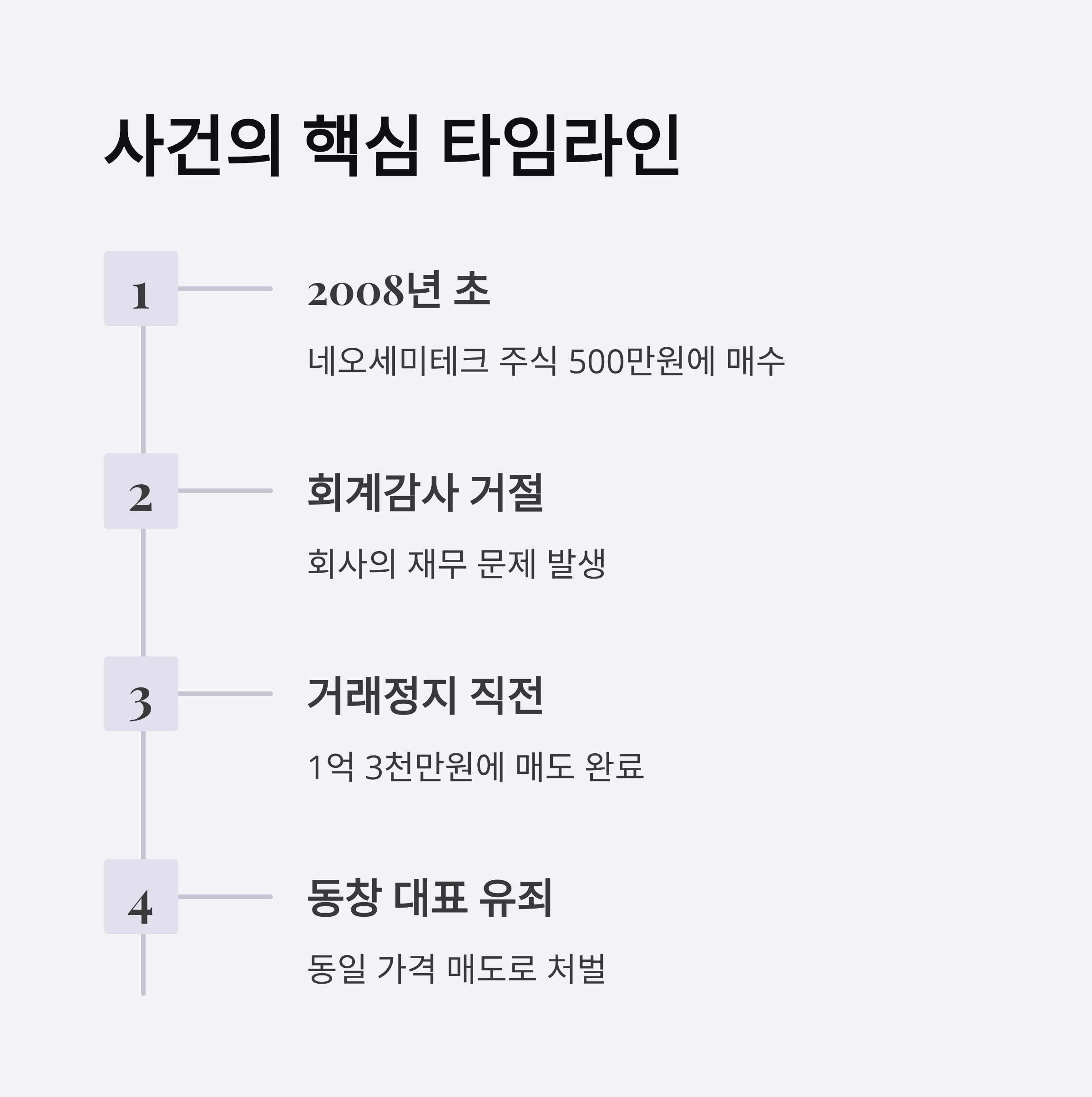 2. 판매 시점은 회사의 회계 감사 거절 및 거래 정지되기 직전으로 내부 정보 이용 의혹이 제기되었습니다.
