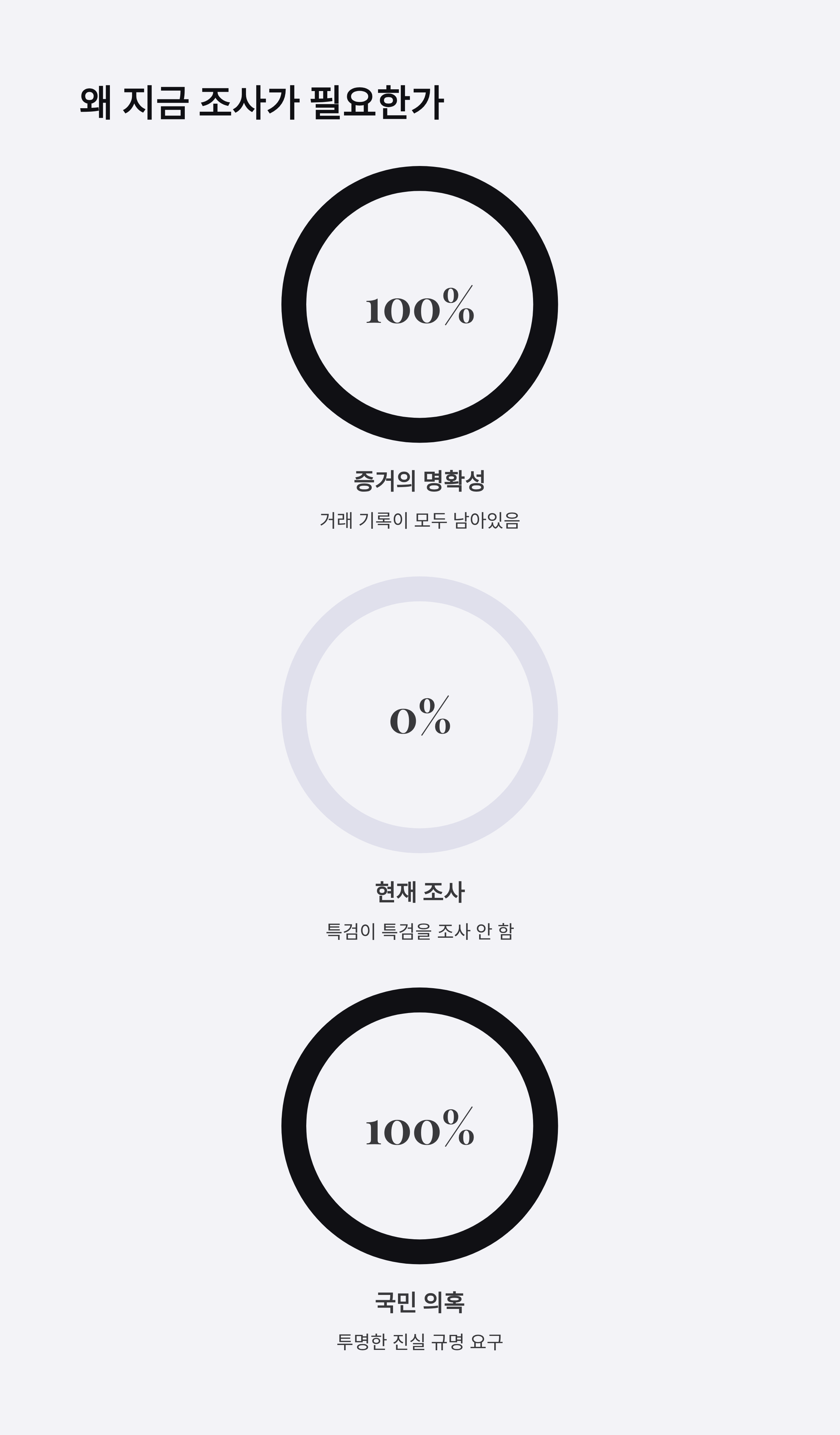가장 주목할 점은 민중기 특검과 그의 고등학교 동창 간의 주식 거래 내역입니다. 양측은 동일 시점에, 동일 비상장 주식의 매도·매수를 단행했습니다. 특히 거래 시점 자체가 회사의 회계 감사 거절 및 거래 정지 직전인 점에서 내부정보에 의한 거래 가능성을 크게 의심케 합니다. 과연 민중기 특검이 증권사 직원의 권유만으로 수십 배 차익을 남겼는가에 대해서는 완벽히 밝혀내야 합니다. 이는 시장의 신뢰 문제와도 직결되는 중대한 사안입니다.
