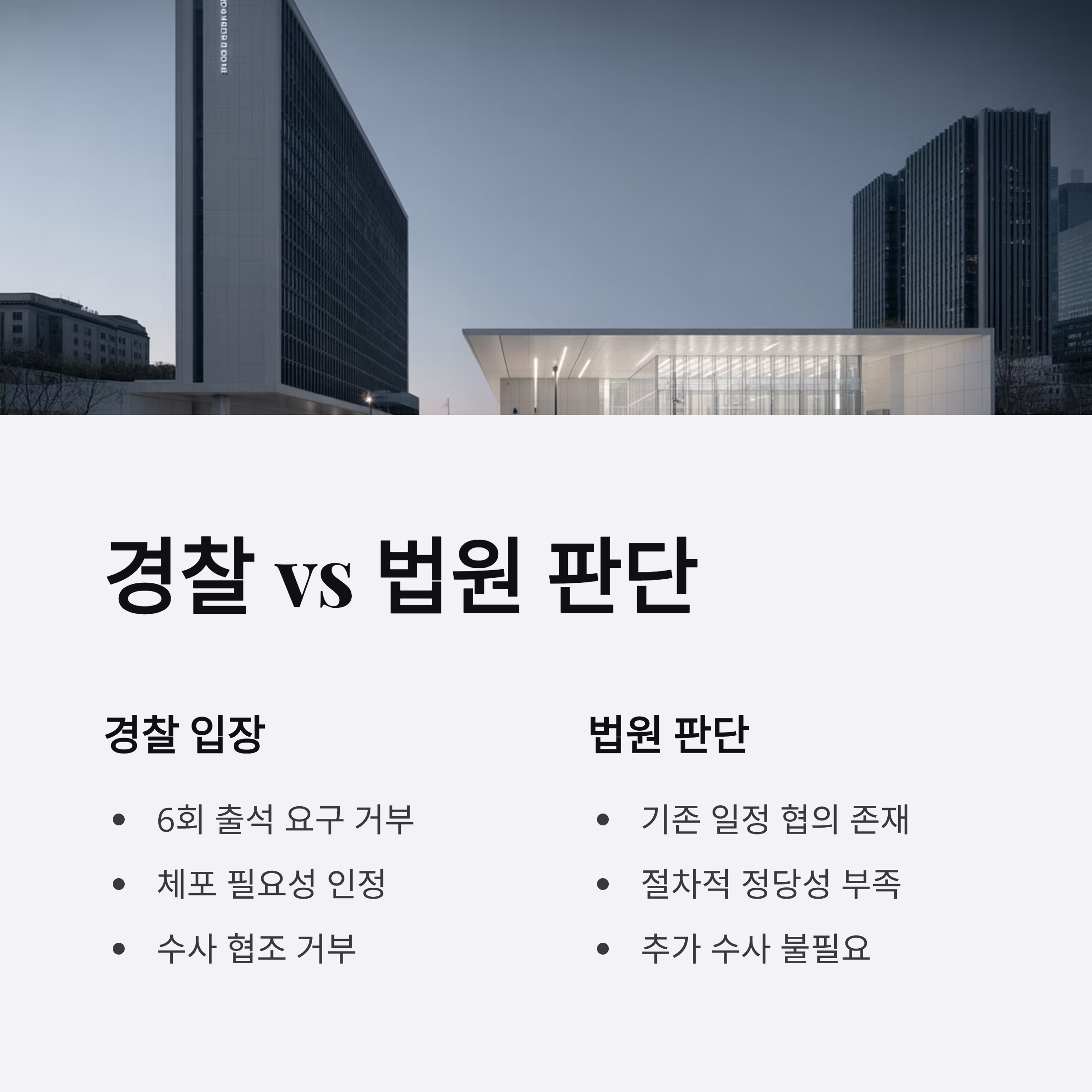 경찰은 이 전 위원장이 6회에 걸친 출석 요구를 거부한 점을 들어 체포영장을 신청했고, 이를 바탕으로 체포를 집행했습니다. 반면 법원은 기존 일정 협의가 있었다고 판단, 충분한 논의 없이 경찰이 추가 출석 요구를 했다는 점에서 경찰의 개입을 재평가했습니다. 이러한 판단은 공무 수행 중의 행계가 절차적 정당성 또는 적법절차에 맞지 않으면 체포의 필요성이 합리적 이유를 상실할 수 있음을 명확히 한 측면으로도 평가됩니다.