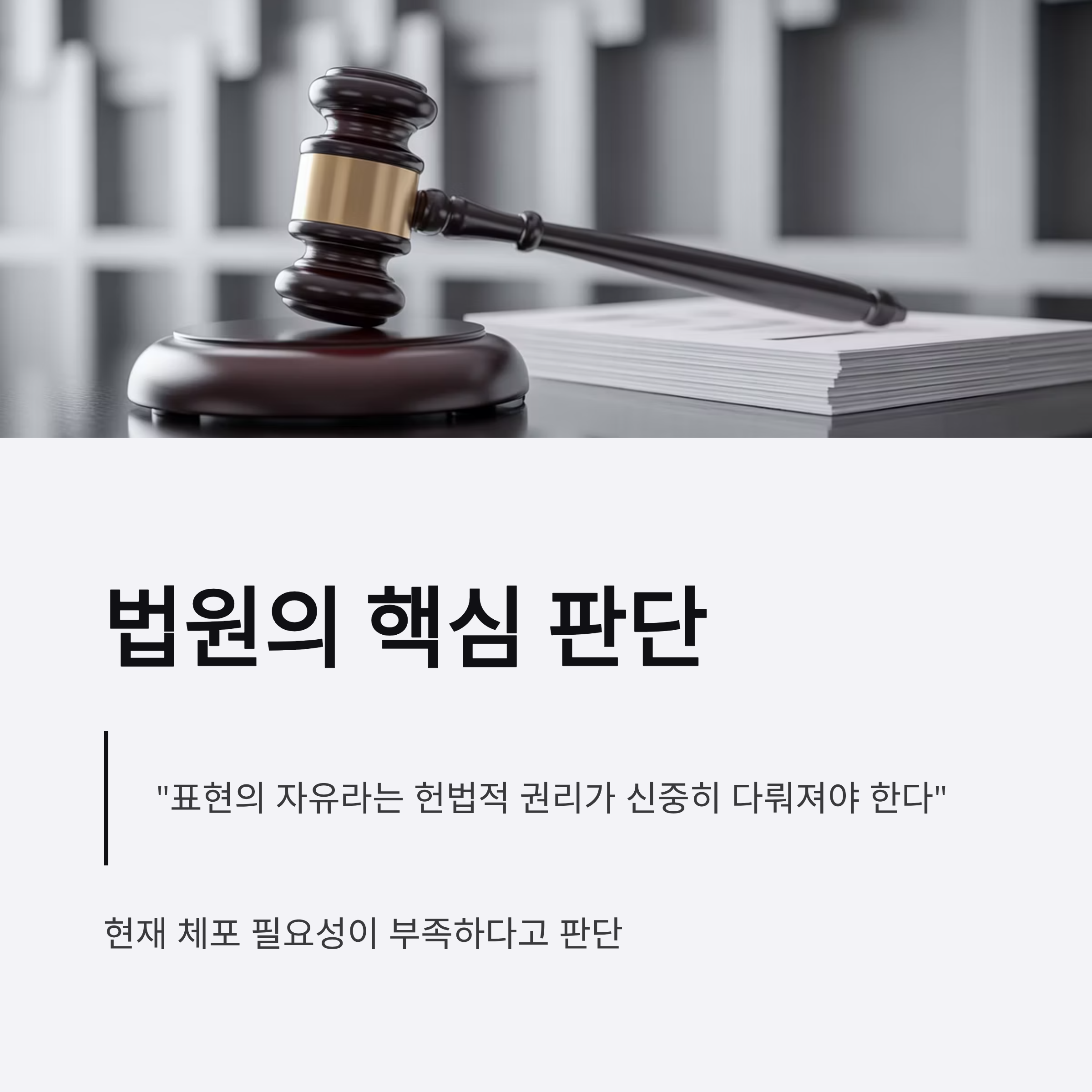 재판부는 이진숙 전 위원장의 체포 결정에 대한 적부심을 인용하며, "표현의 자유"라는 헌법적 권리가 신중히 다뤄져야 한다고 명확히 밝혔습니다. 이는 단순히 개인의 방어권 강화 차원을 넘어, 헌법적 가치 중심의 사법 판단이 이루어졌음을 의미합니다. 특히, 체포 상태로 있을 이유가 부족하다는 이유에서 경찰의 체포 과정을 비판적으로 다시 검토한 점은 체포영장 발부와 집행 과정이 항상 법적 정당성을 가져야 함을 강조한 선례로 남을 가능성이 있습니다.