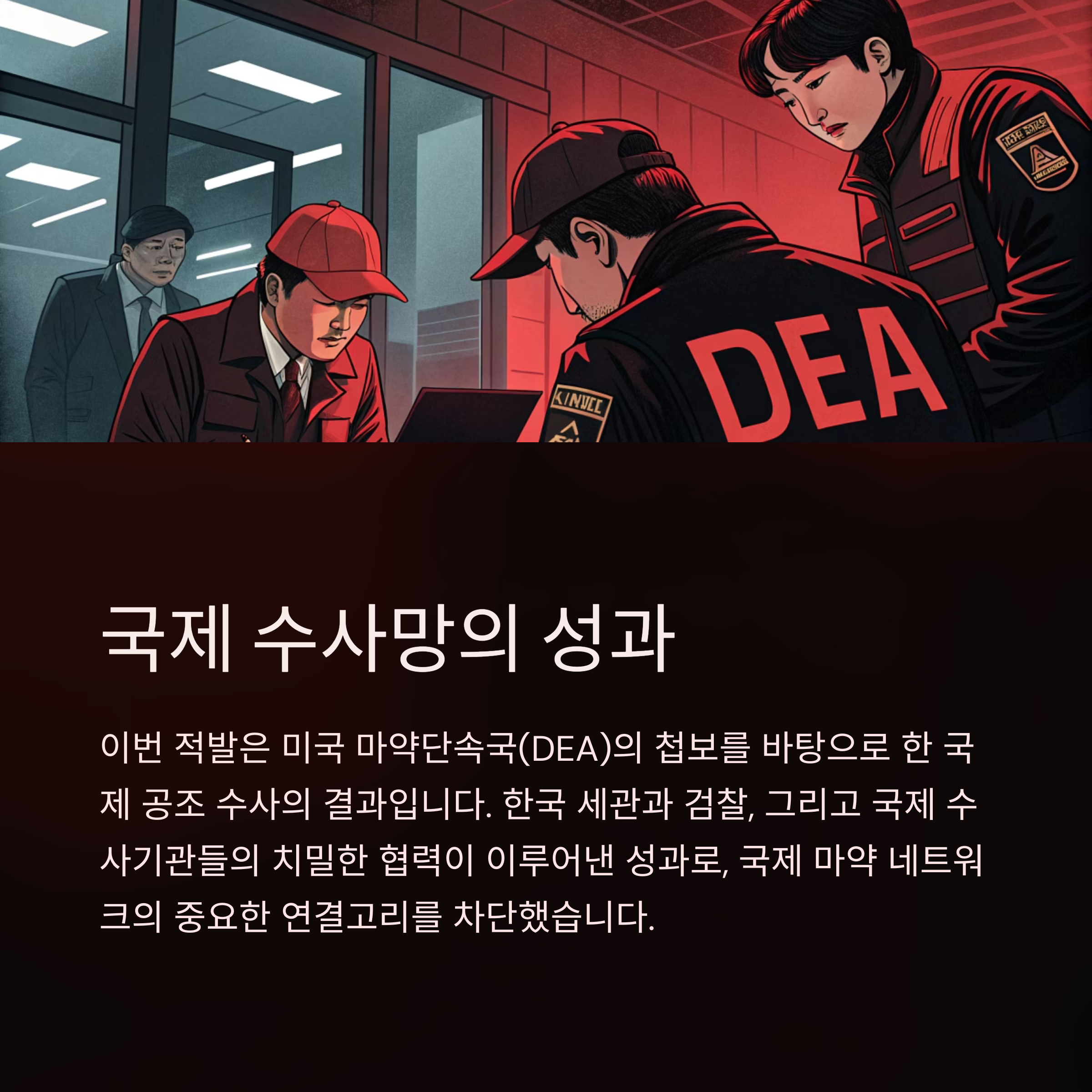 부산항에서 적발된 코카인 사건은 미국 마약단속국(DEA)의 첩보를 근거로 이루어진 것으로, 이는 국제적 정보 공유 체계의 중요성을 보여줍니다. DEA는 남미 지역에서 기원한 마약이 아시아로 유입될 수 있다는 점을 역추적했으며, 이를 한국 세관과 공유하며 수사 범위를 확대했습니다. 이번 사건은 국제 협력을 통해 전략적 대응이 이루어진 모범 사례로 평가됩니다.