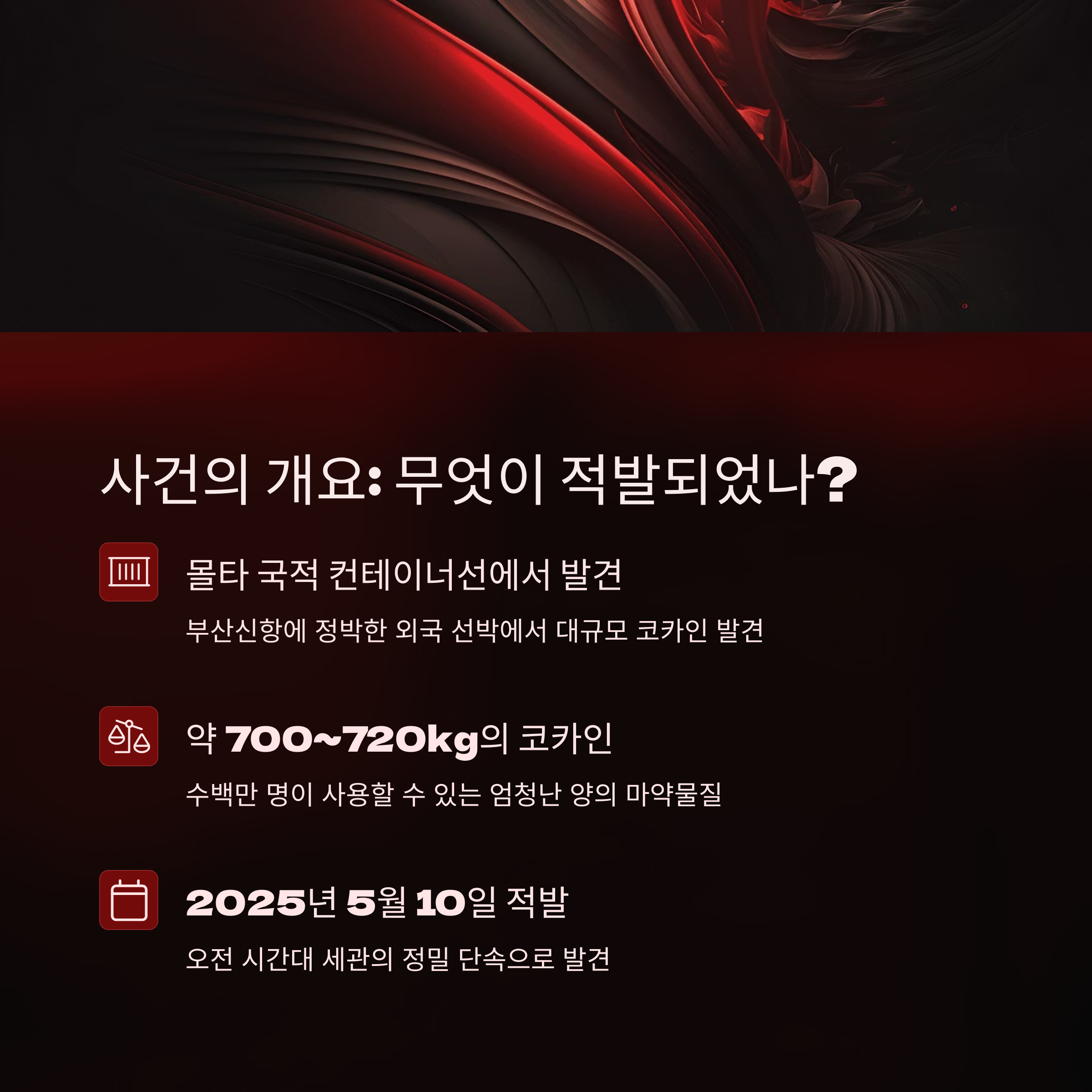- 부산신항에서 약 700~720kg의 코카인이 몰타 국적의 컨테이너선에서 적발되었습니다.