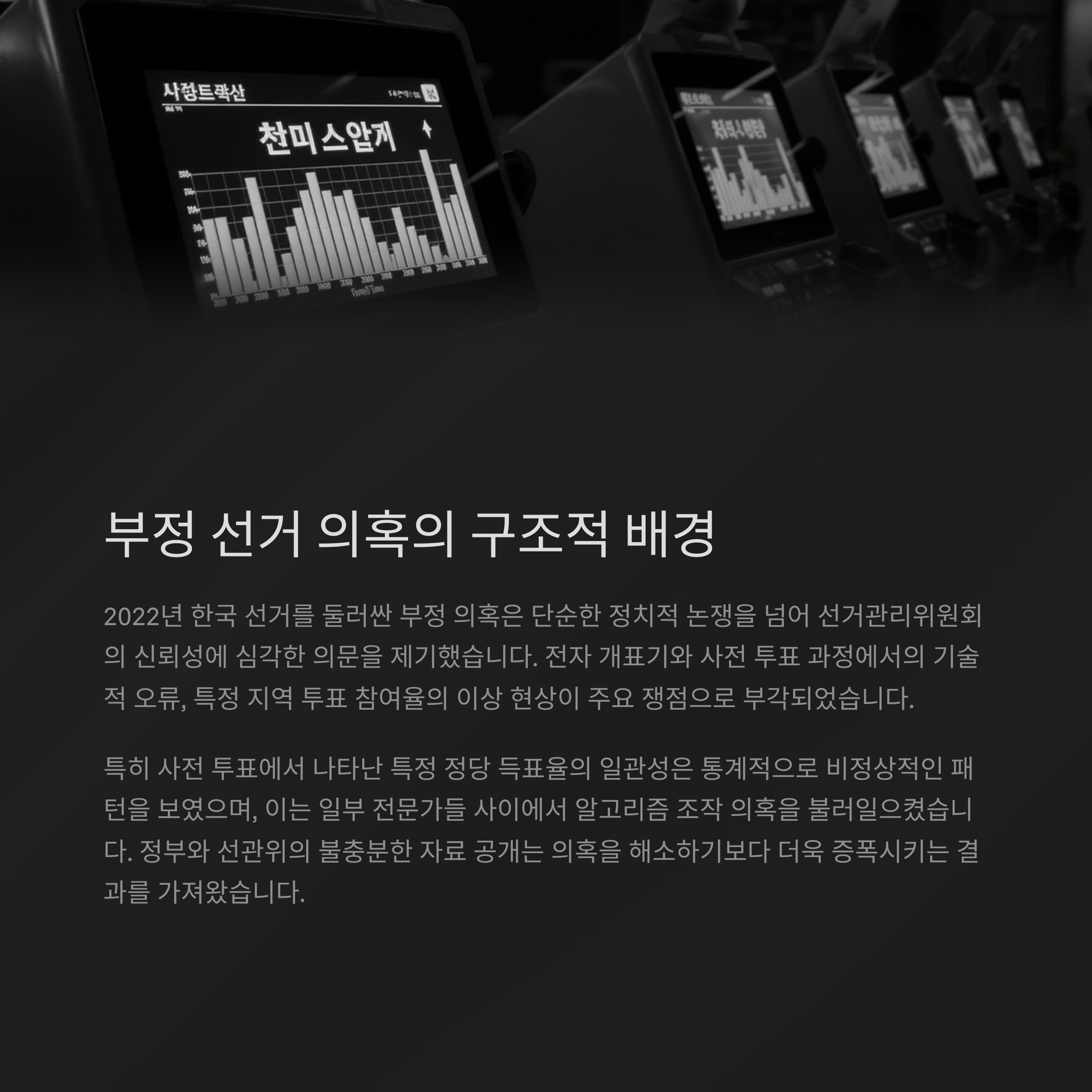 2022년 한국의 부정 선거 의혹은 단순히 정치적 논쟁을 넘어 중앙선거관리위원회의 신뢰와 공정성을 위협한 사건으로 평가되고 있다. 전자 개표기와 사전 투표 과정에서의 기술적 오류, 특정 지역의 투표 참여율 이상 현상 등이 주요 문제로 대두되었다. 분석 결과, 사전 투표에서의 특정 정당 득표율의 일관성은 통계적으로 비정상적인 패턴을 보였으며, 이는 일부 전문가들 사이에서 알고리즘 조작 의혹을 불러일으켰다.