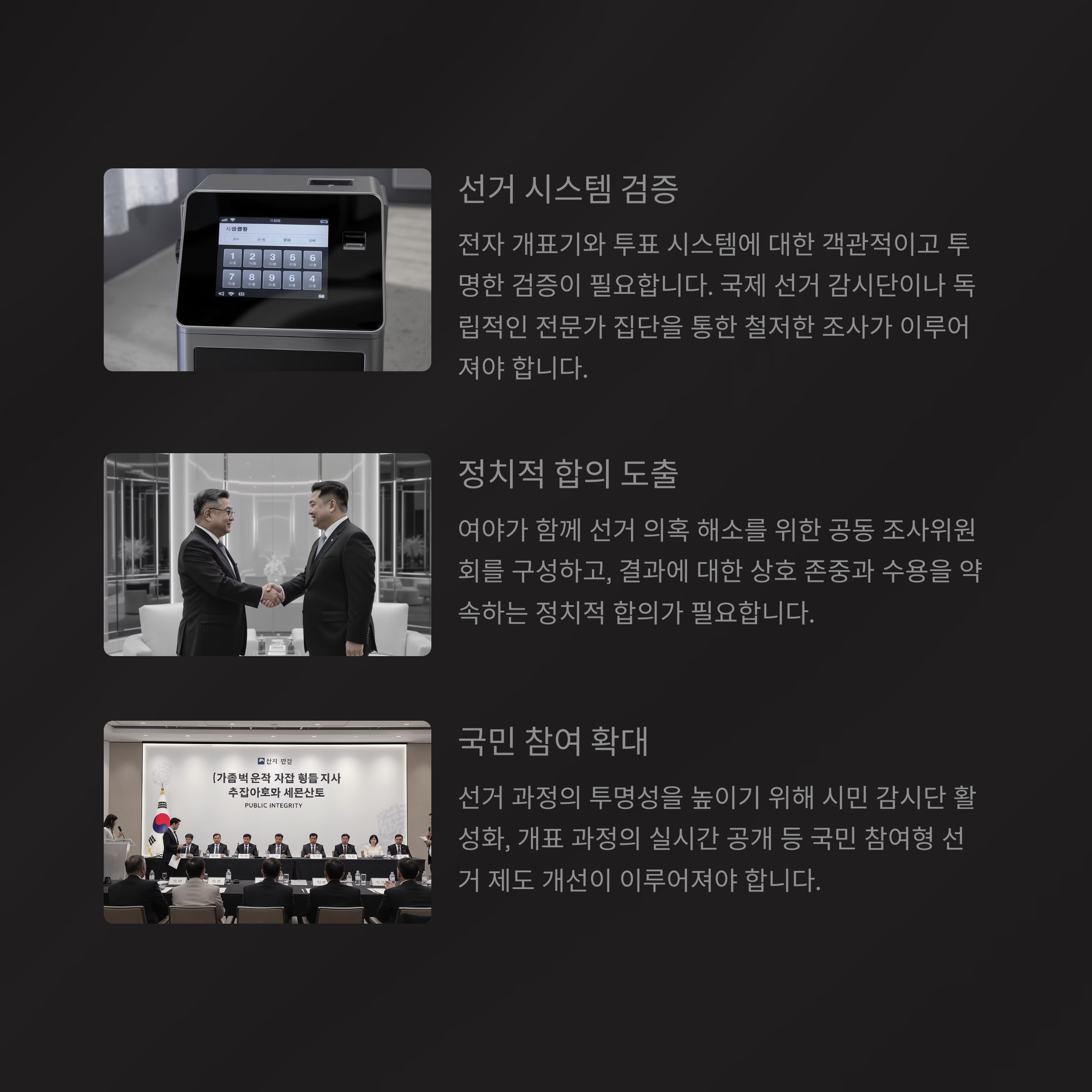 | A. 투명성을 강화한 선거 시스템 검증, 신속한 논란 해소, 그리고 국제적 신뢰를 회복할 수 있는 외교적 노력이 필요합니다. |