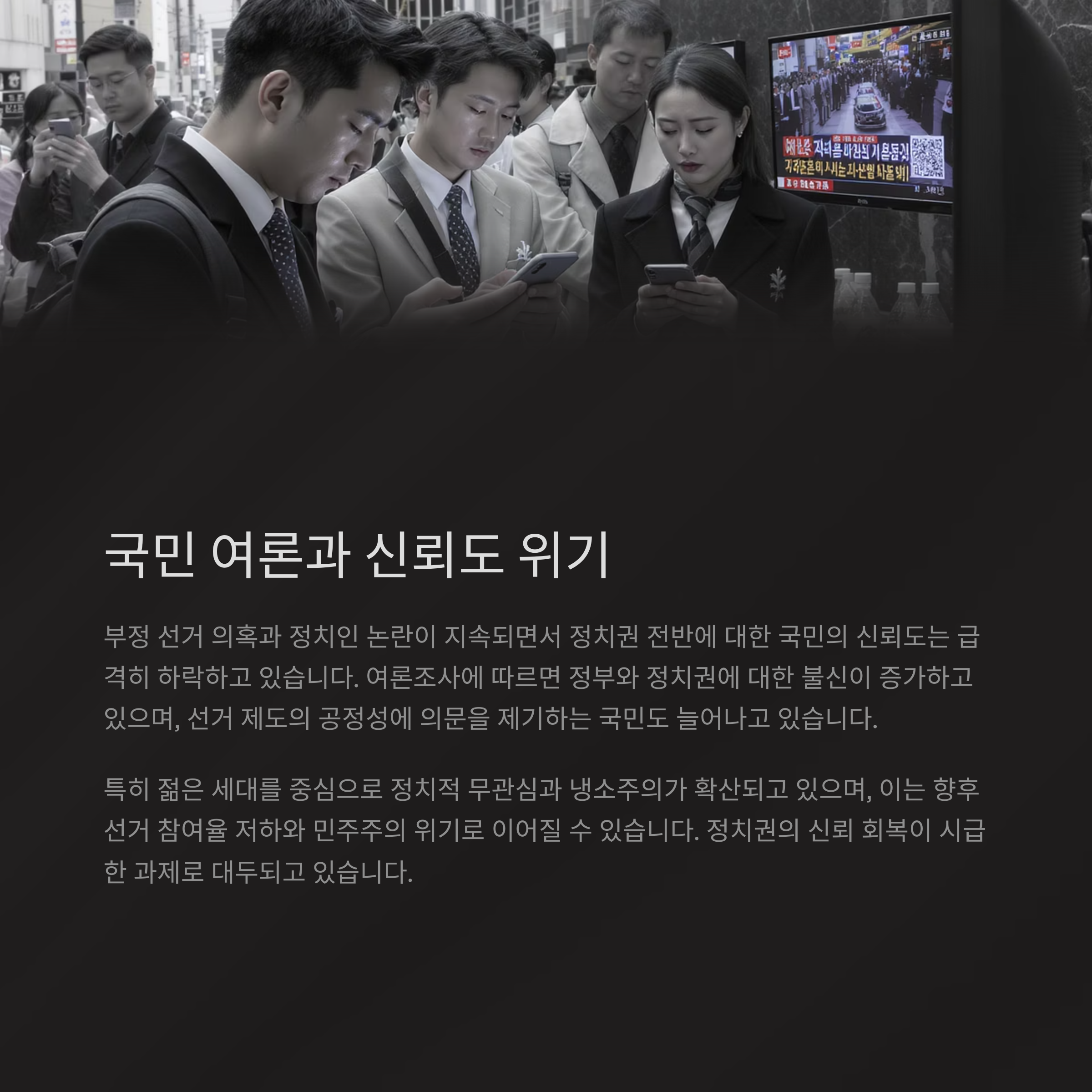 - 정치적 신뢰도 시험대: 문제 해결과 국민적 신뢰 회복이 한국 정치권에 중요한 과제로 부상했습니다.