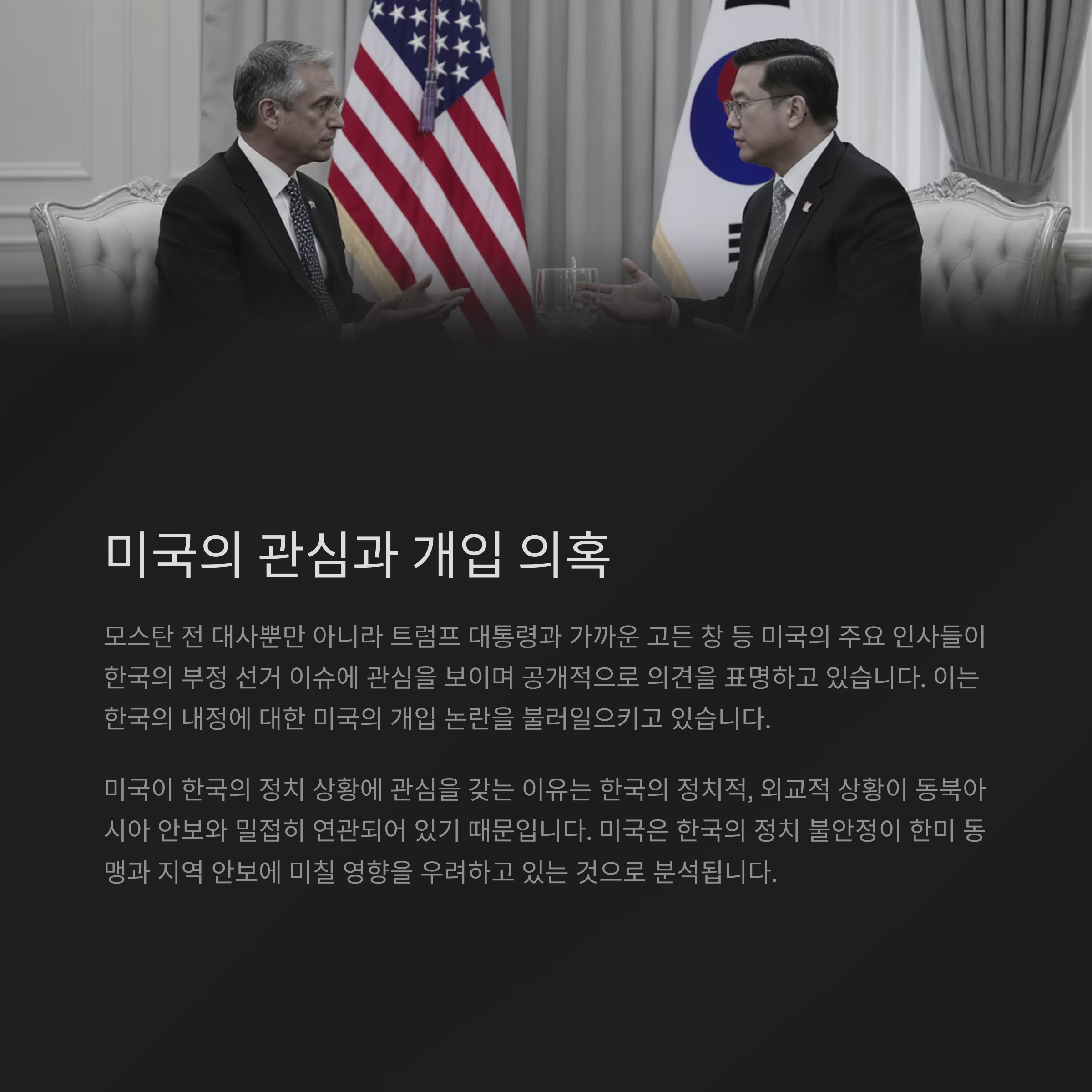 미국의 주요 인사들이 한국의 부정 선거 이슈에 관심을 보이며, 특정 의혹을 공개적으로 제기한 점은 사건을 단순한 국내 문제로 한정짓지 않게 만든다. 특히, 모스탄 전 대사와 고든 창의 발언은 한국의 선거 시스템과 법률 제도가 국제 사회의 신뢰를 받지 못하고 있다는 반증으로 해석될 수 있다.