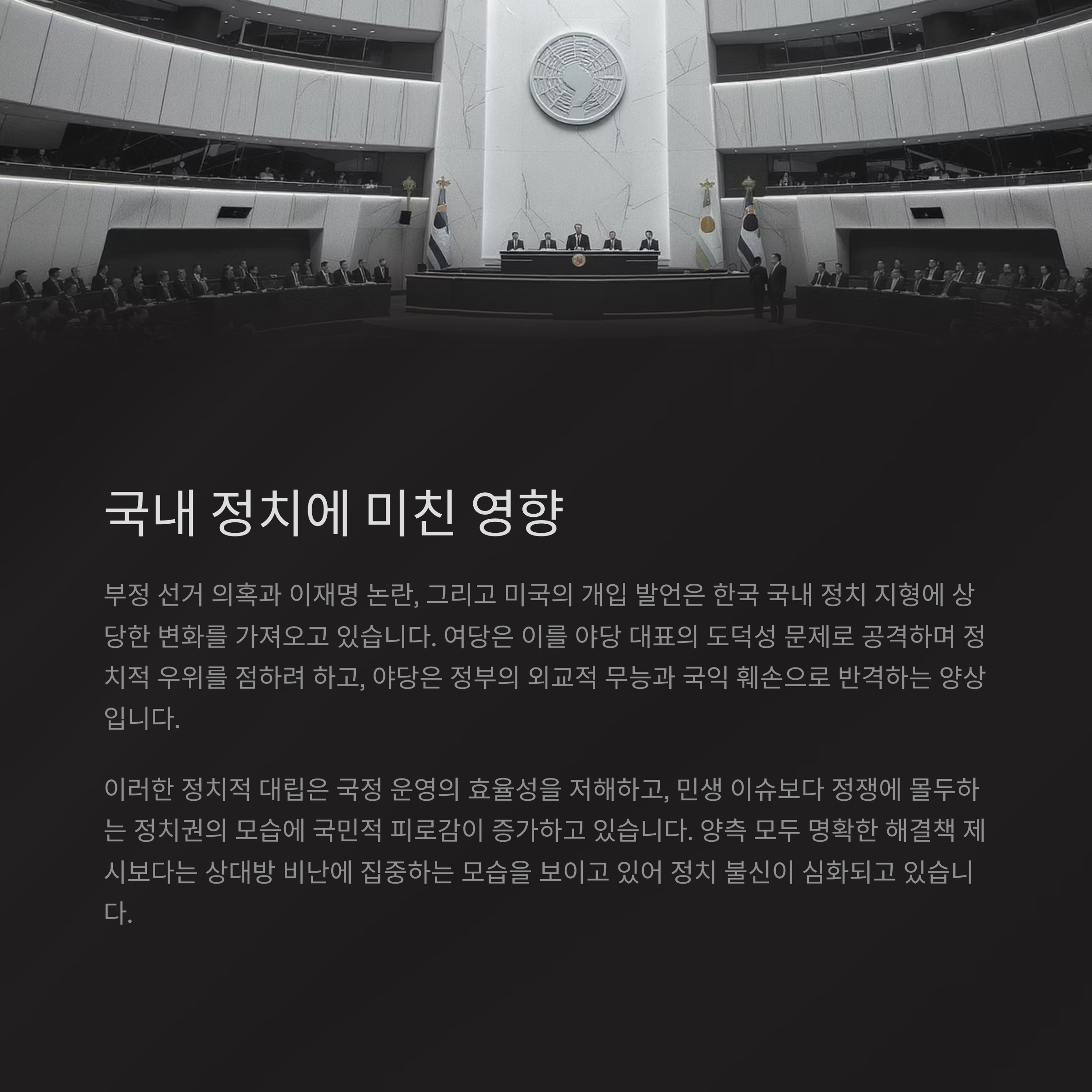 - 미국의 개입 가능성: 모스탄 전 대사 등 미국 인사들의 공개 발언으로 국내 이슈의 국제화가 가속화되는 모습입니다.