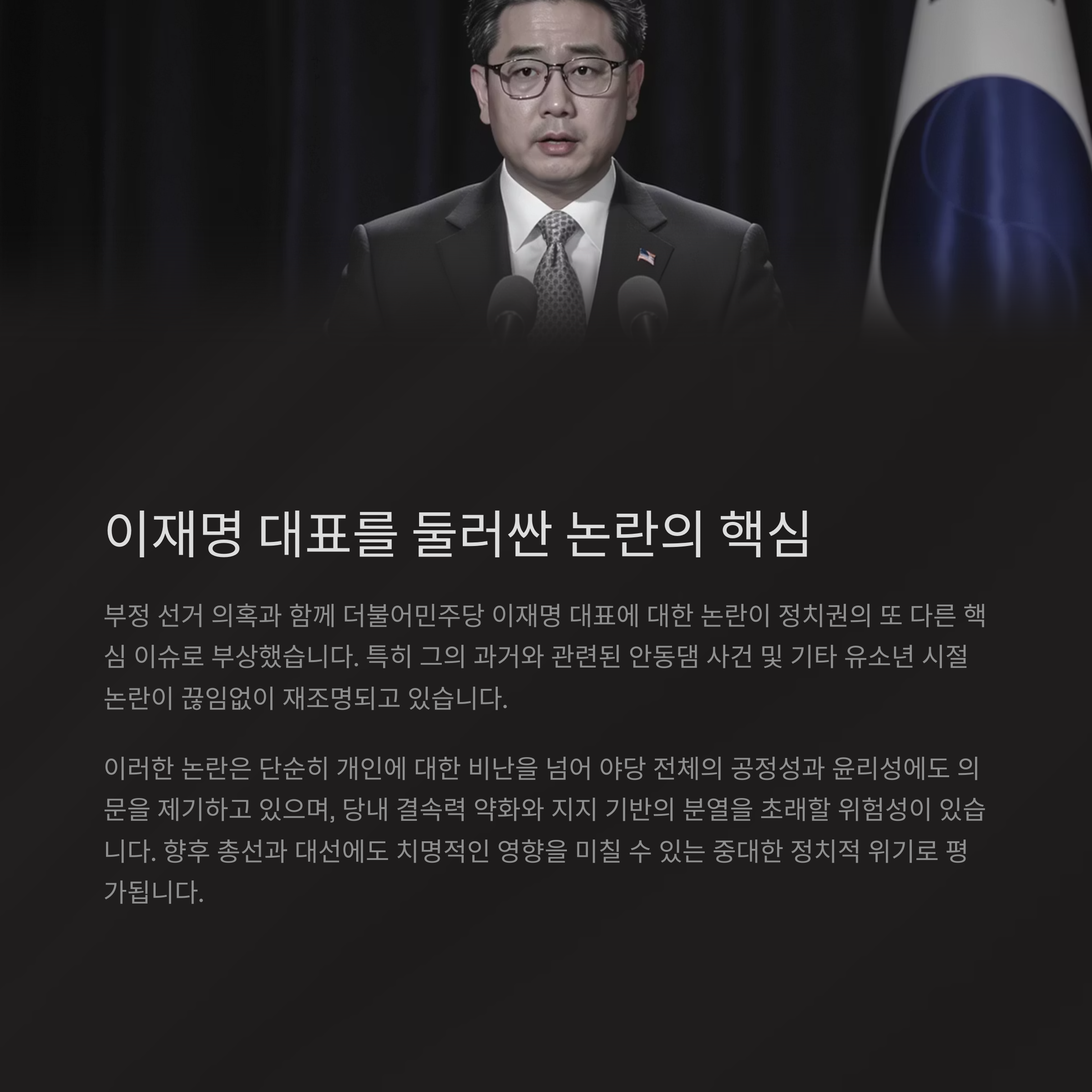 - 안동댐 사건 연관: 유소년 시절의 사건이 재조명되며 이재명 대표에게 치명적일 가능성이 있습니다.