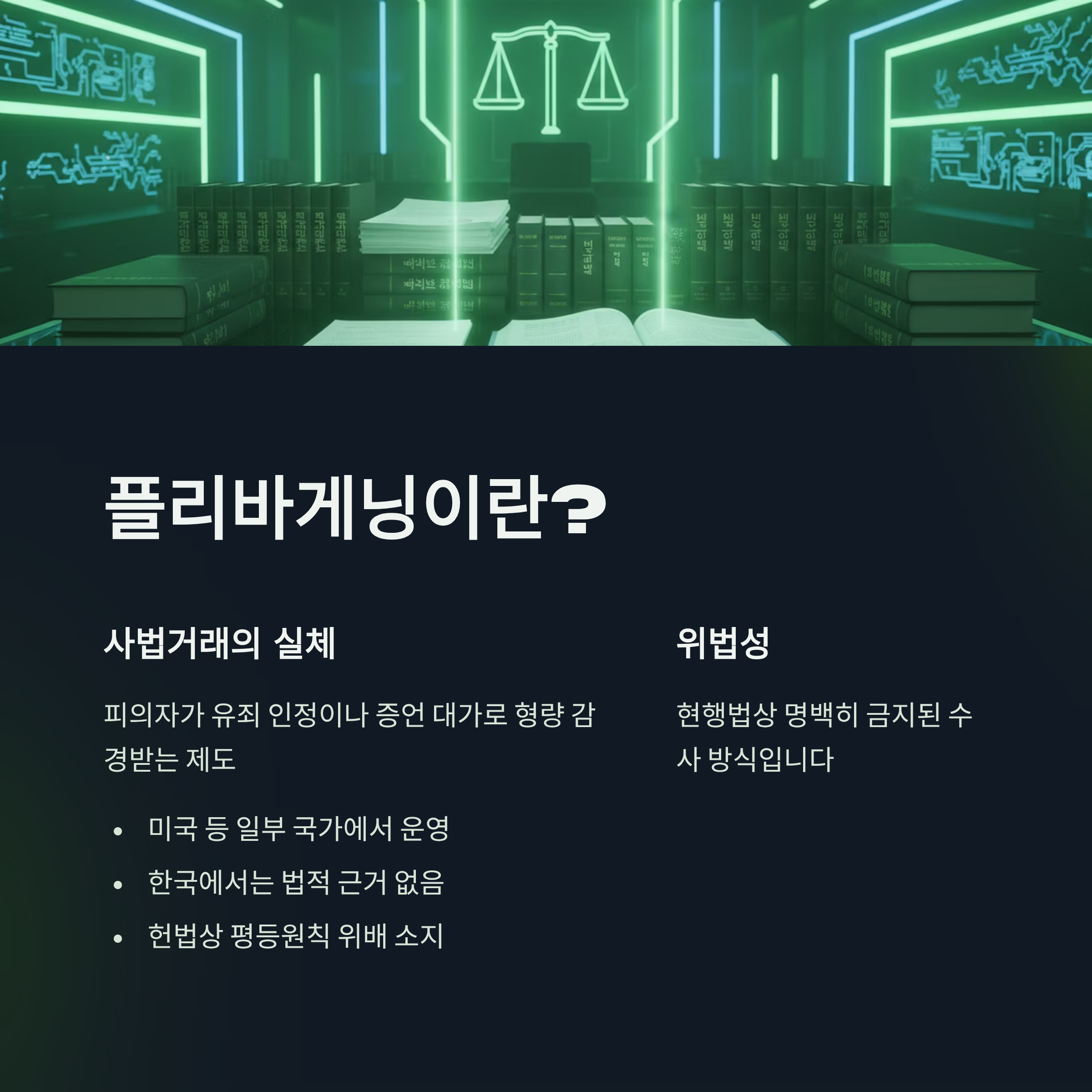 2. 플리바게닝의 위법성: 대한민국 현행법상 플리바게닝은 제도적으로 도입되지 않았으며, 이를 수사 과정에 적용하는 것은 위법 소지가 매우 큽니다.