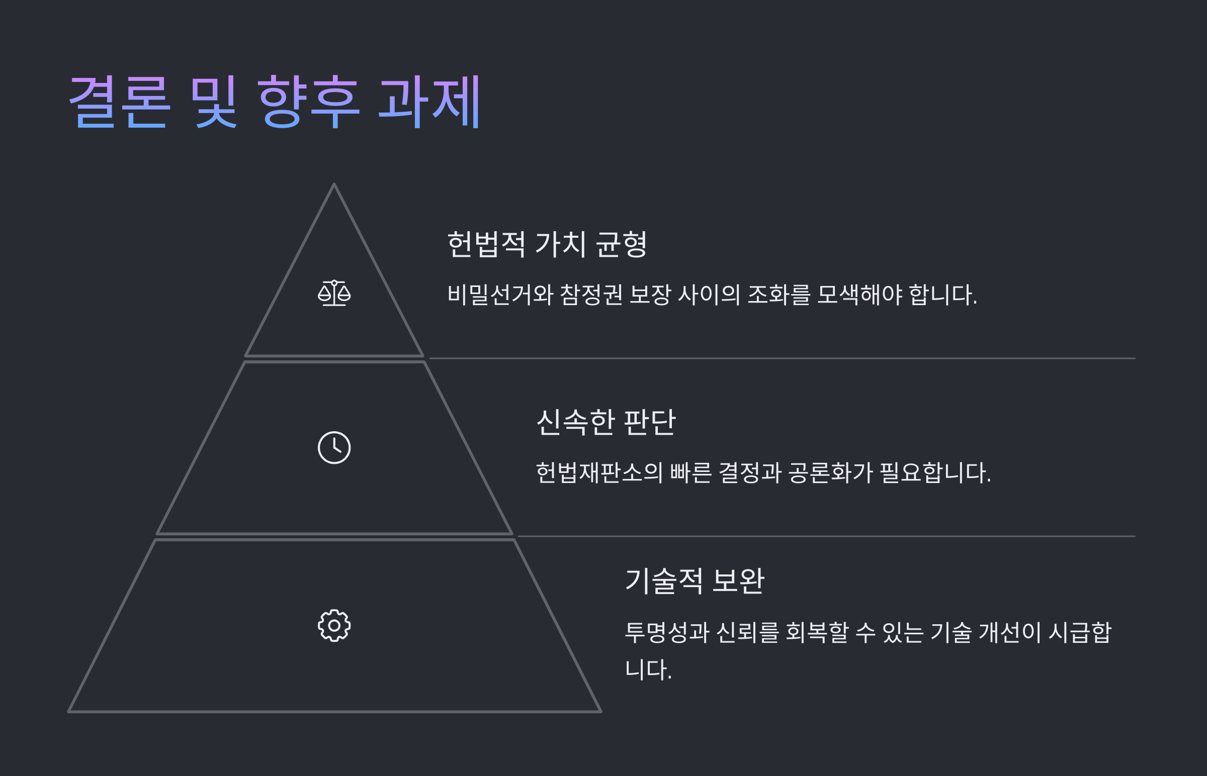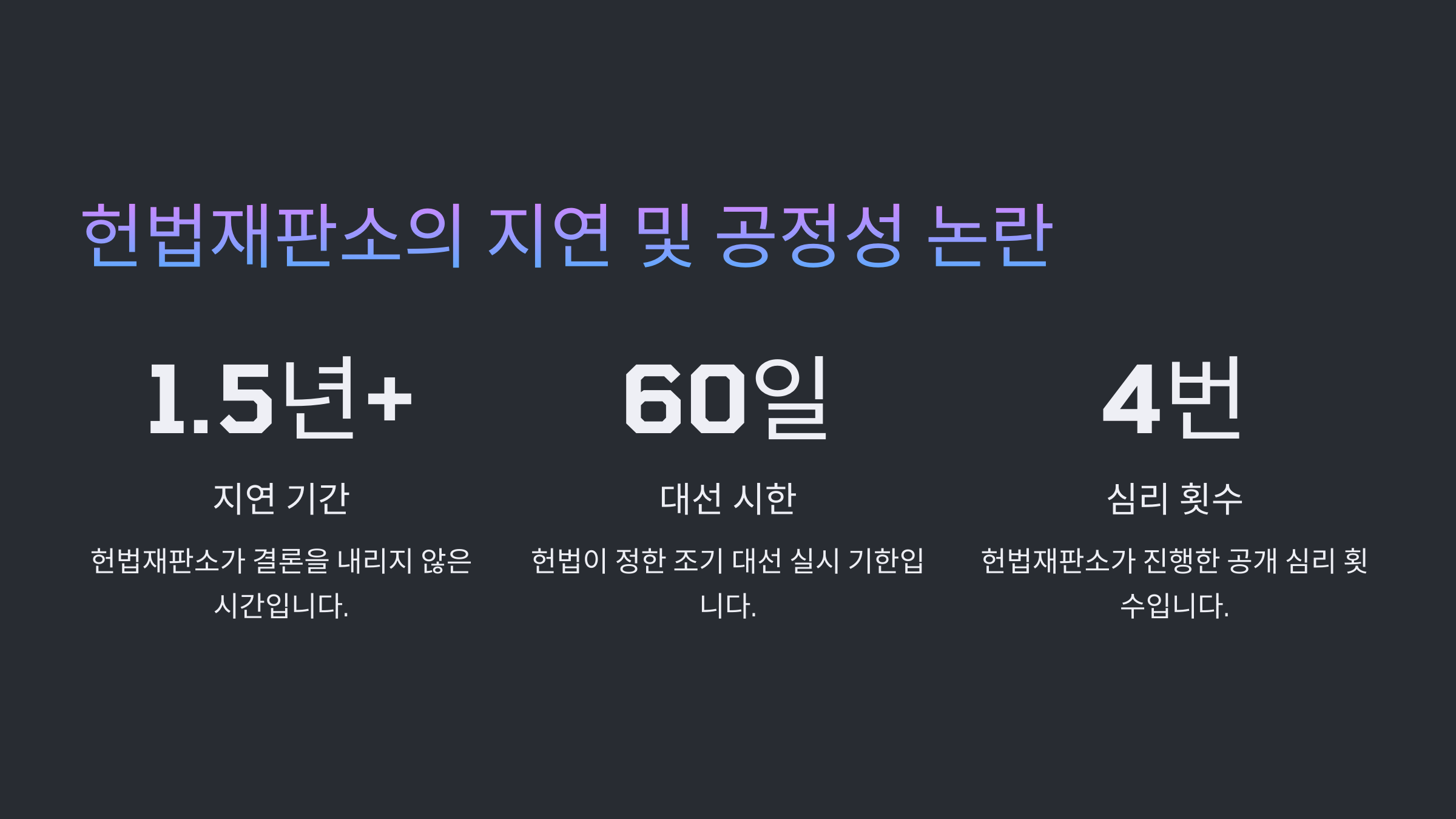 헌법재판소는 대한민국의 마지막 헌법 해석자이자 민주주의의 최후 보루입니다. 그러나 사회적으로 민감한 사안을 미루고 정치적 중립성이 흔들릴 경우, 사법부 전체의 신뢰가 훼손될 수 있습니다. 특히 선거와 같은 국민 주권이 실현되는 핵심 절차에 대한 판단을 미룬다는 것은 헌재의 존재 이유를 의심받게 하는 중대한 문제입니다.